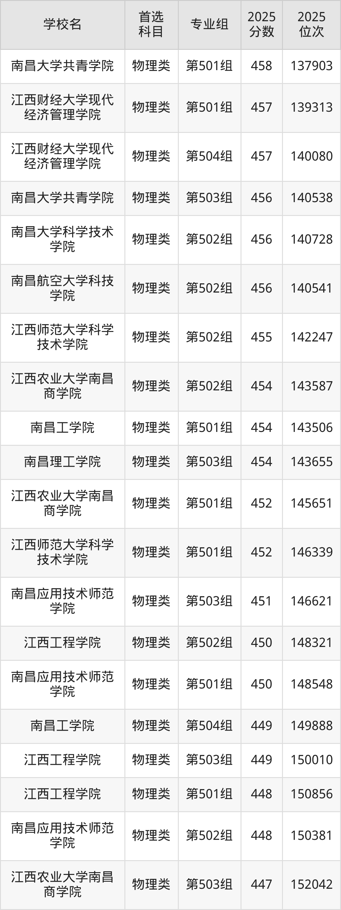 2025年一共有18所民办本科在江西物理类招生,包含了51个专业组,录取分数线从429分到469分不等,对应最低位次从172066名到123684名。下面分别展示江西省分数线最高、最低的五个院校专业组。