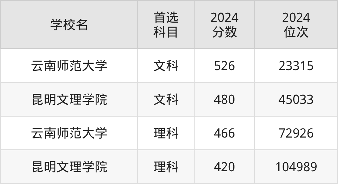 2024年云南本科批次线文科480分、理科420分。因此昆明考生如果想留在市内读师范类大学的话,文科考生刚过本科线就行、而理科考生刚过本科线就行。