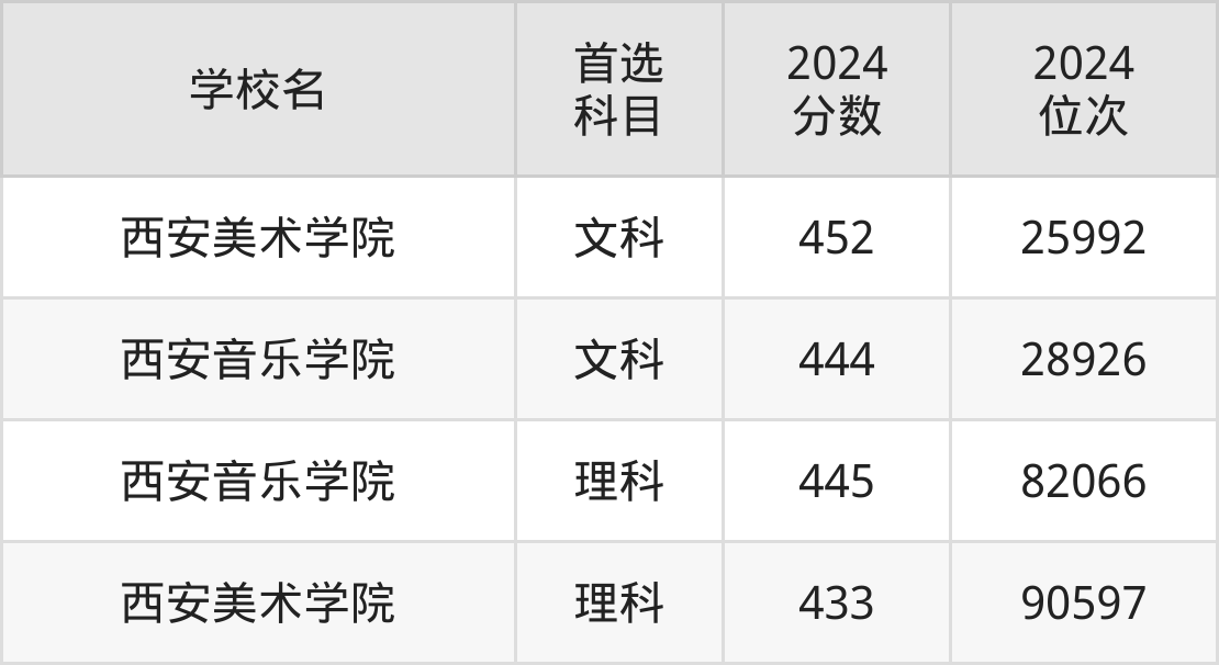 2024年一共有2所艺术类大学在西安文科招生,录取分数线从444分到452分不等,对应最低位次从28926名到25992名。
