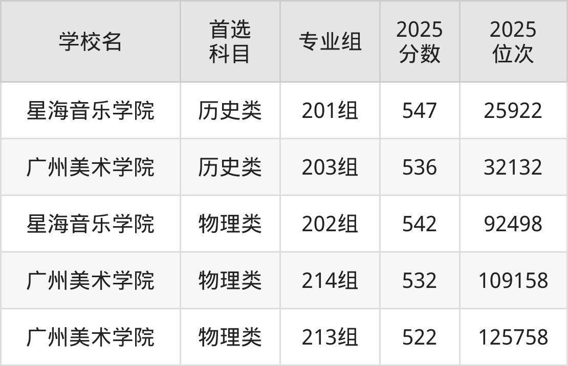 2025年一共有2所艺术类大学在广东物理类招生,包含了3个专业组,录取分数线从522分到542分不等,对应最低位次从125758名到92498名。