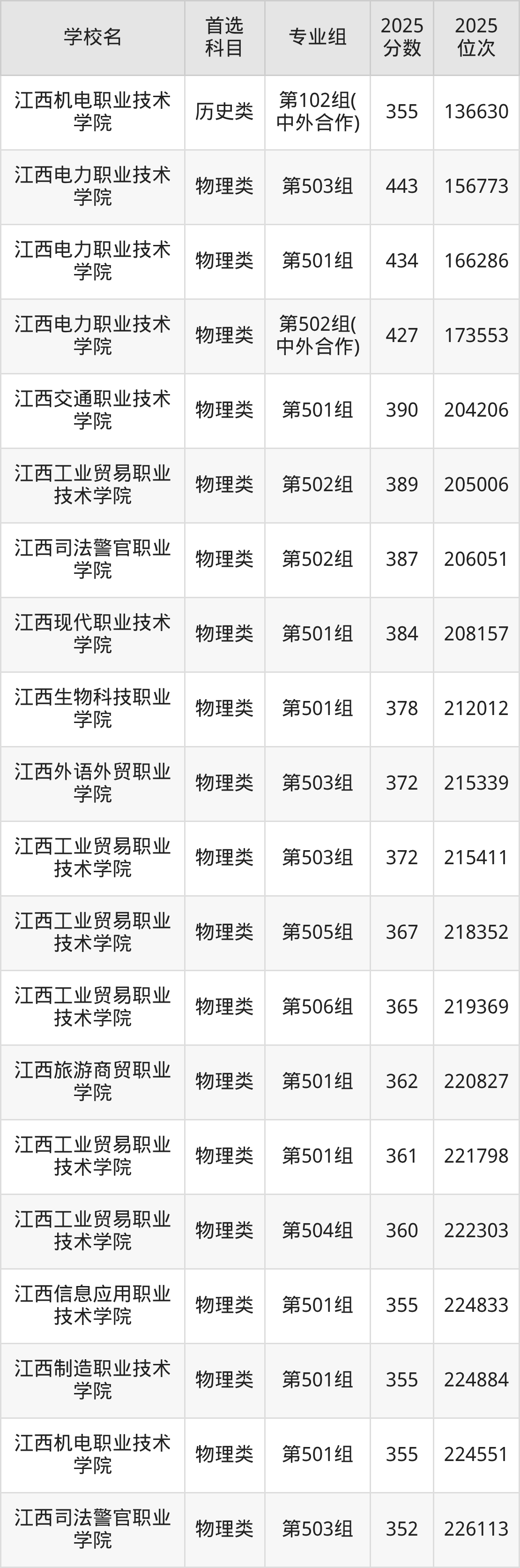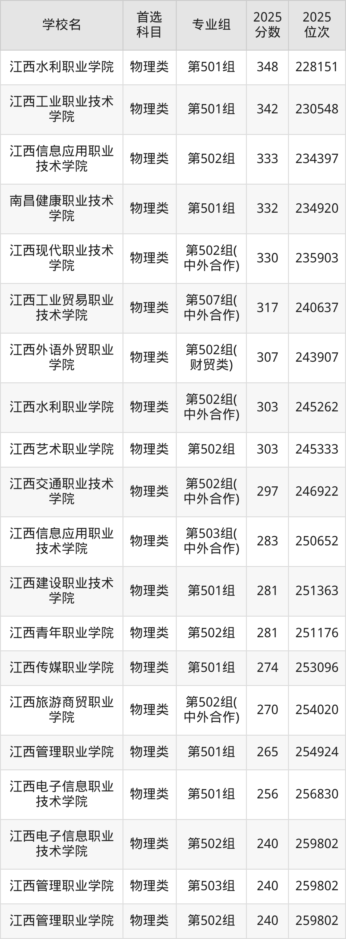 (4)江西工程职业学院第501组:240分、259802名;
