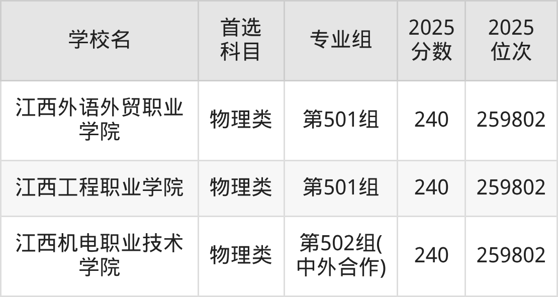 (3)江西外语外贸职业学院第501组:240分、259802名;
