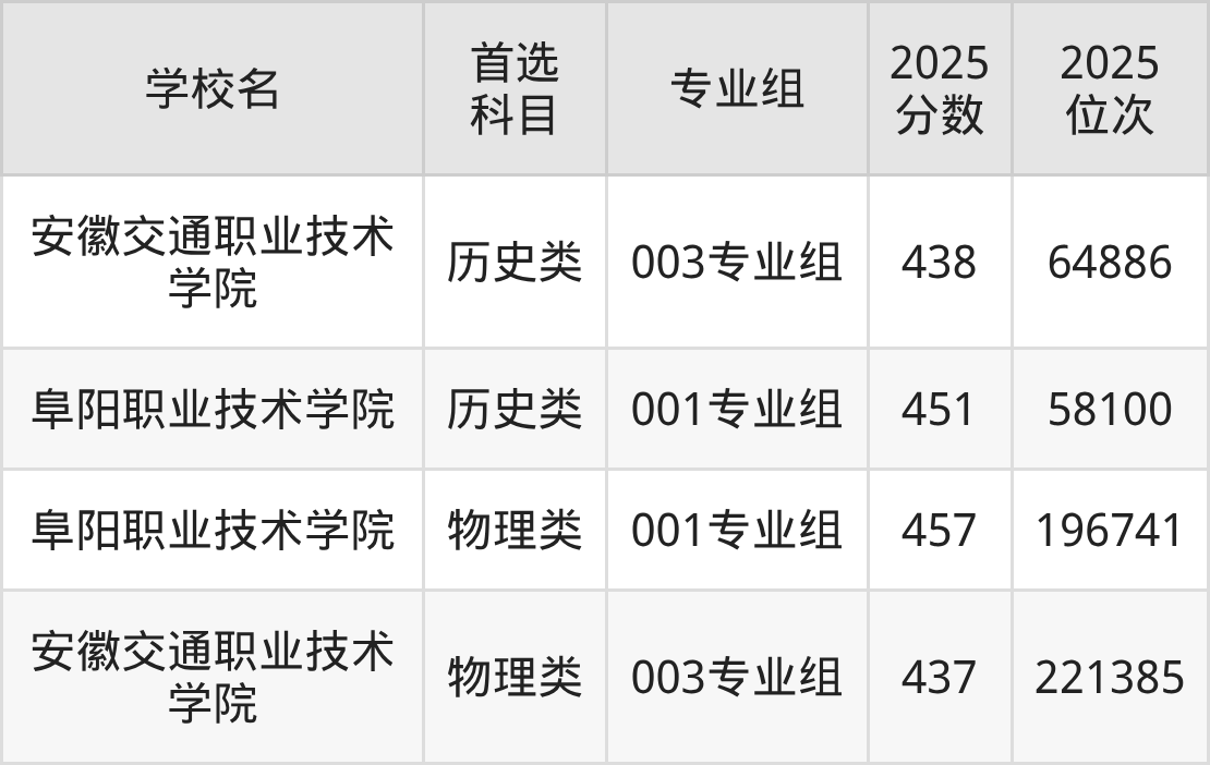 (2)安徽交通职业技术学院003专业组:437分、221385名;