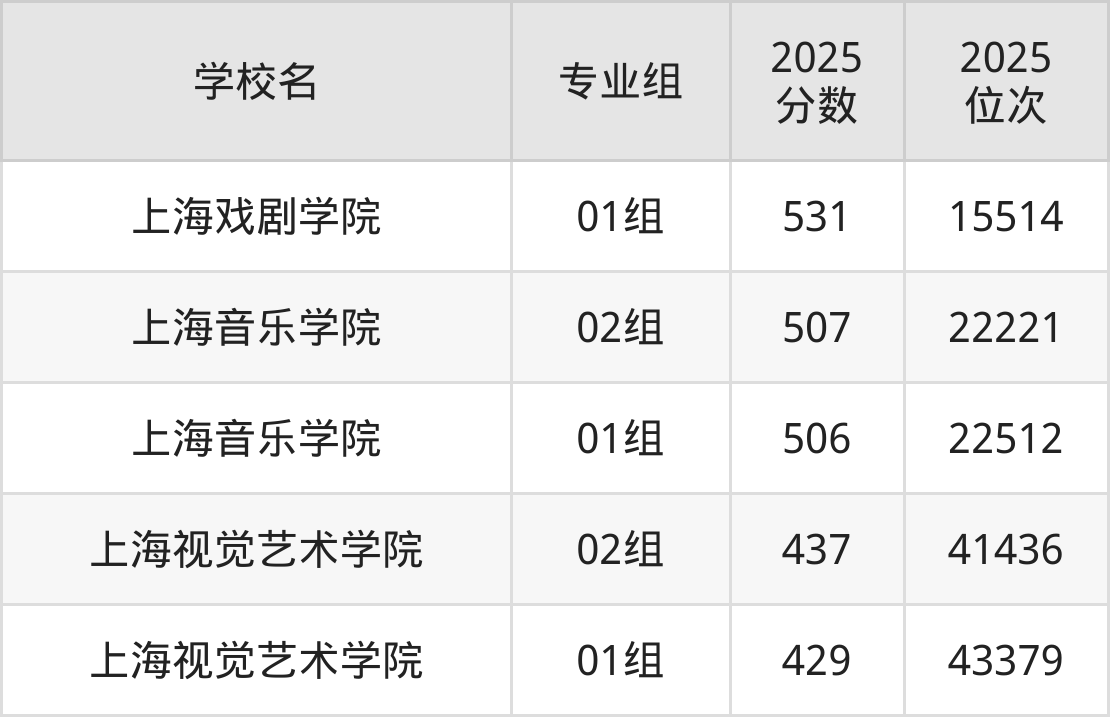 2025年一共有3所艺术类大学在上海招生,包含了5个专业组,录取分数线从429分到531分不等,对应最低位次从43379名到15514名。