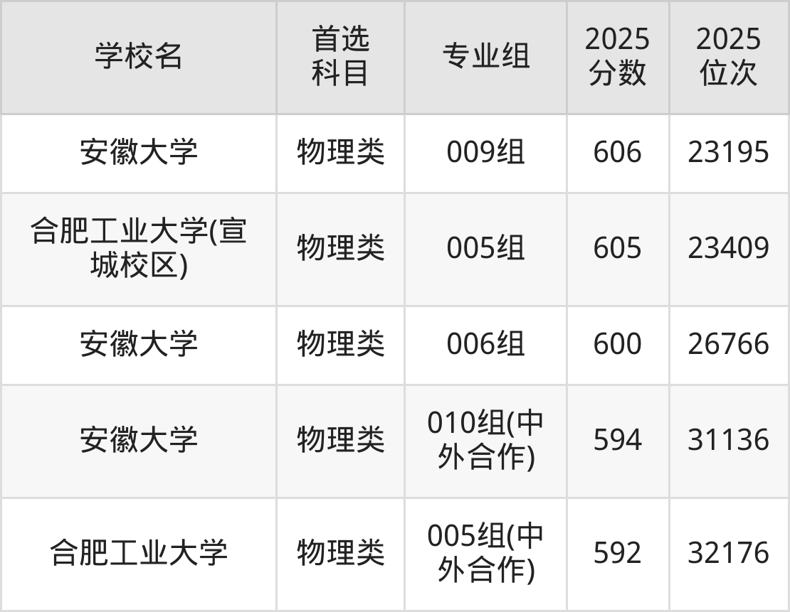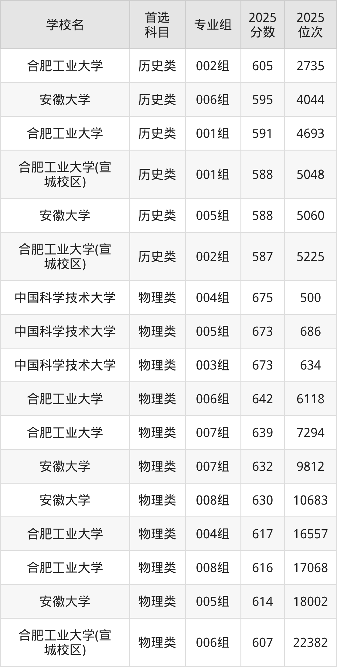 2025年一共有4所211在安徽物理类招生,包含了16个专业组,录取分数线从592分到675分不等,对应最低位次从32176名到500名。下面分别展示安徽省分数线最高、最低的五个院校专业组。