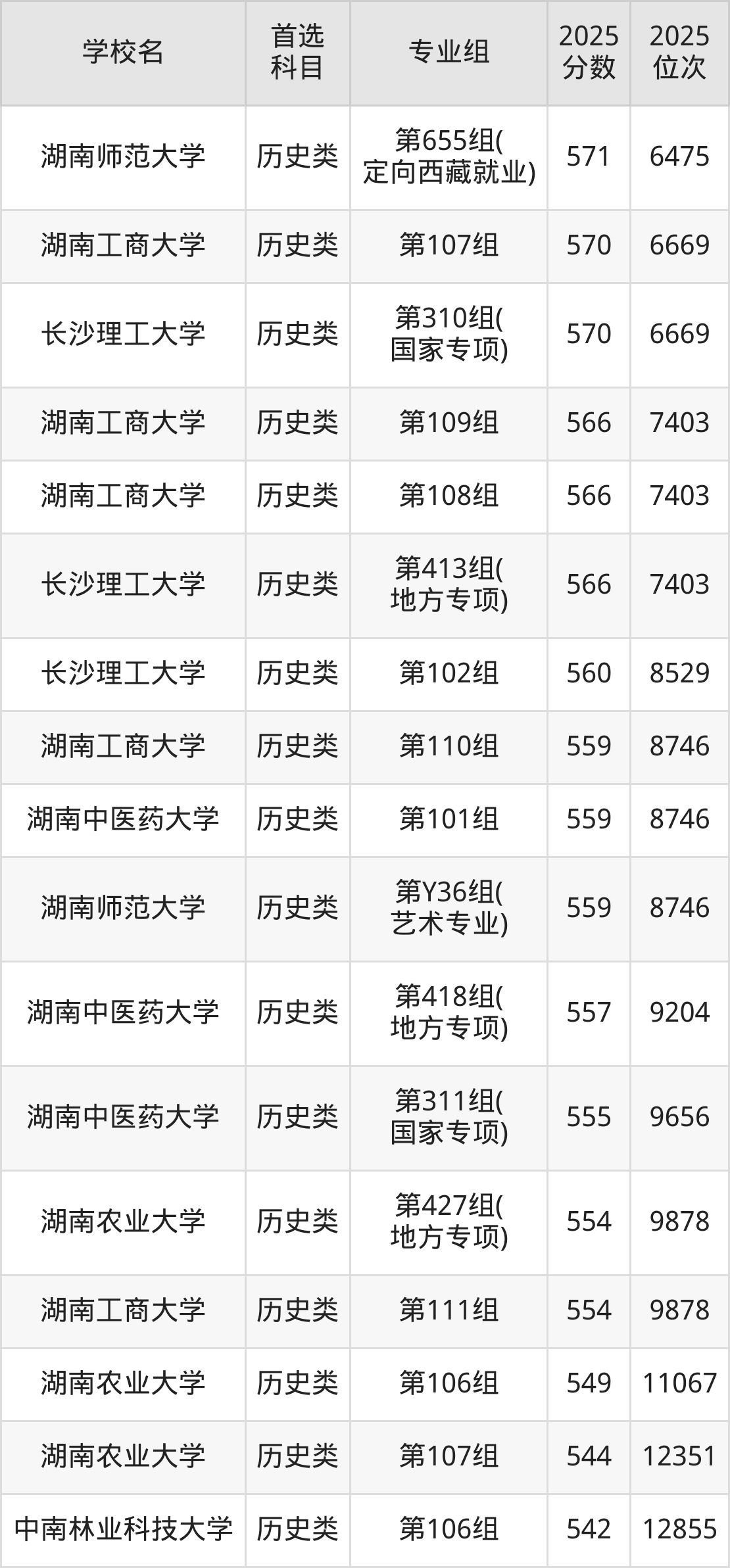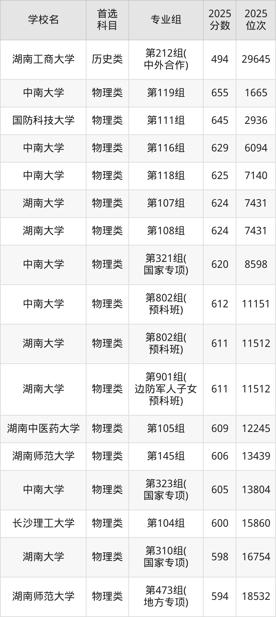 2025年一共有8所一本大学在长沙历史类招生,包含了52个专业组,录取分数线从494分到619分不等,对应最低位次从29645名到930名。下面分别展示长沙市分数线最高、最低的五个院校专业组。