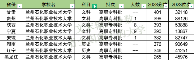 2023年兰州石化职业技术大学专科的文科招生,在黑龙江省最低,需要265分以上,最低分位次45976名。