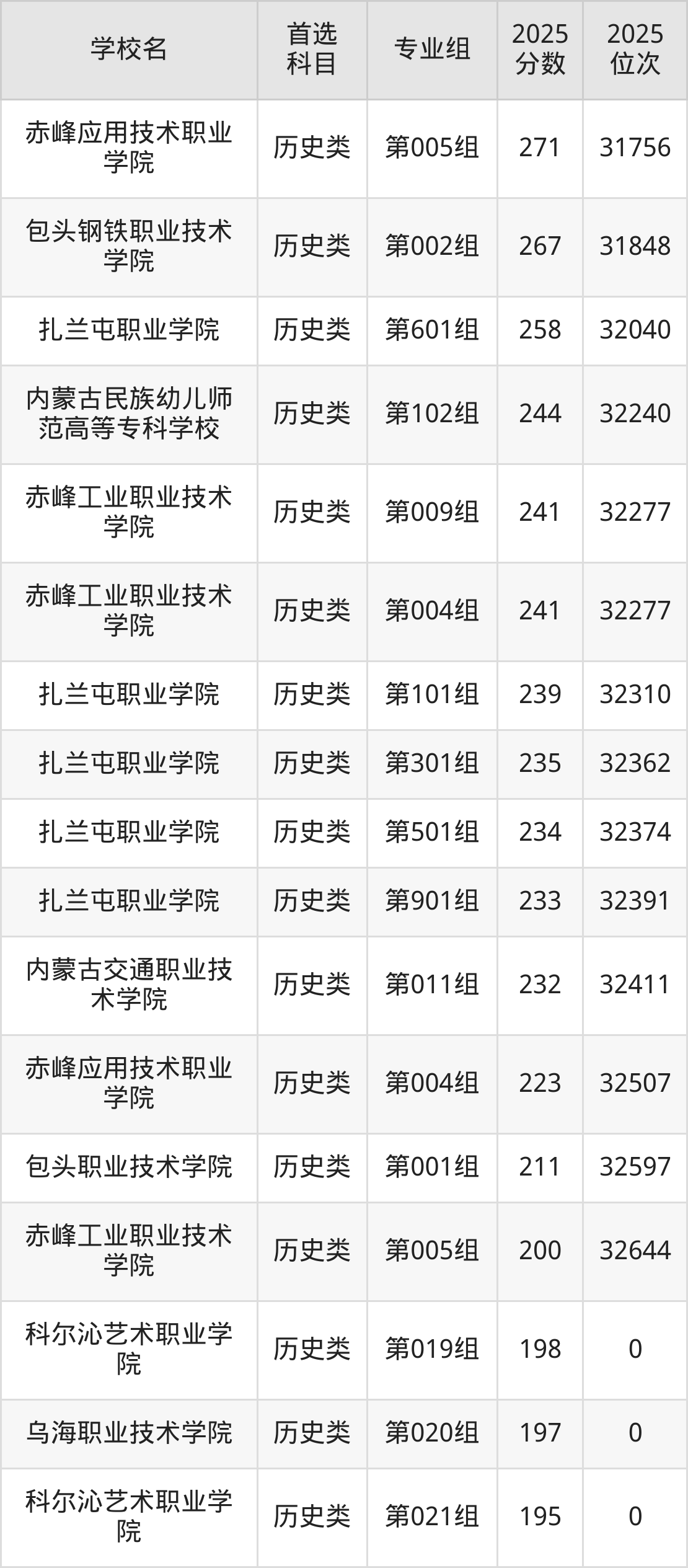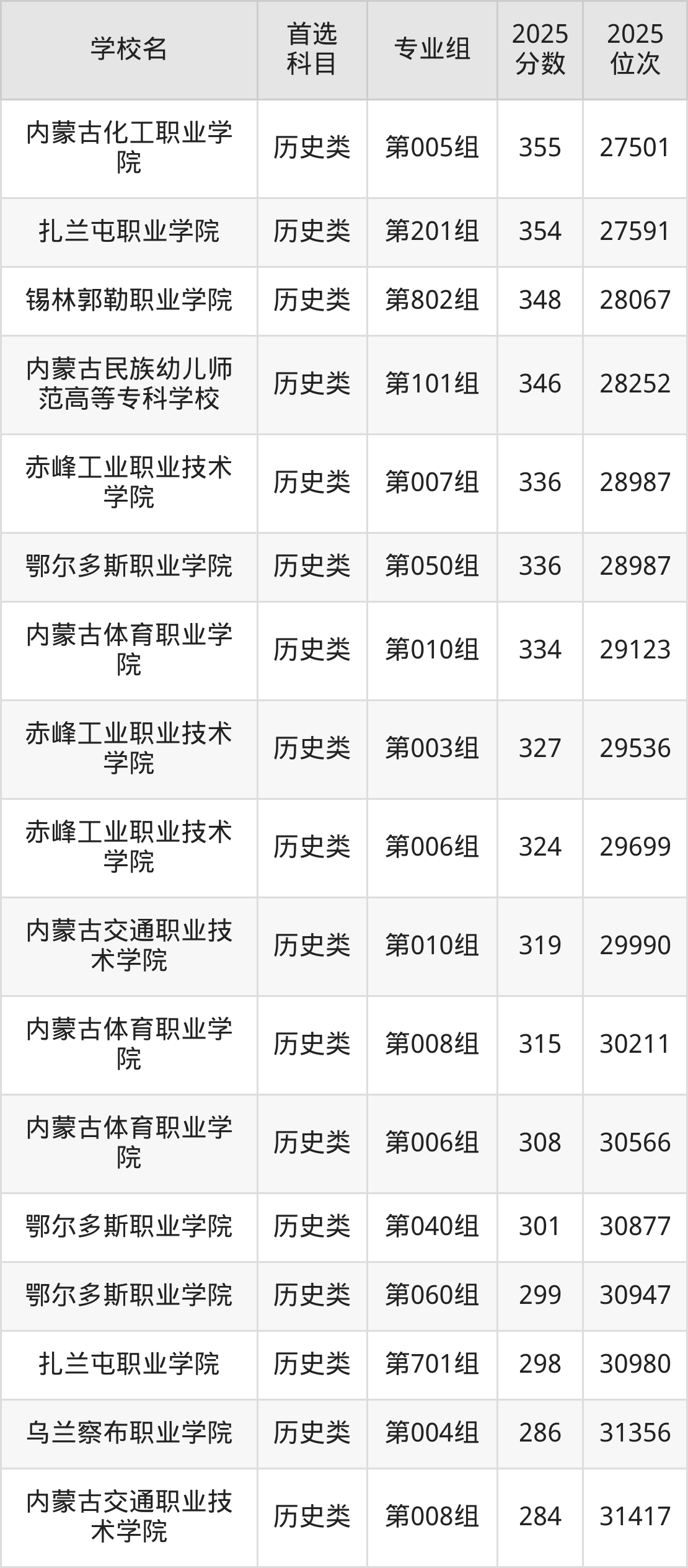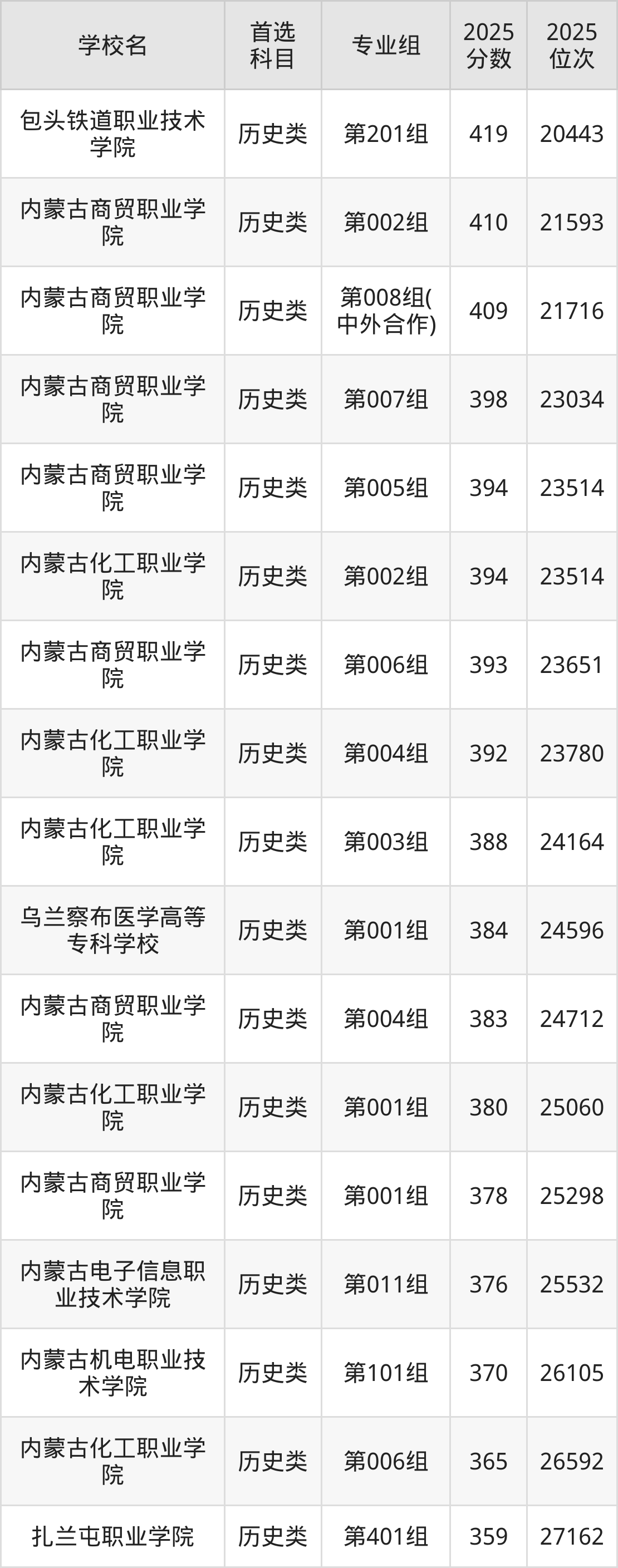 2025年一共有25所公办大专在内蒙古历史类招生,包含了66个专业组,录取分数线从160分到419分不等。下面分别展示内蒙古自治区分数线最高、最低的五个院校专业组。