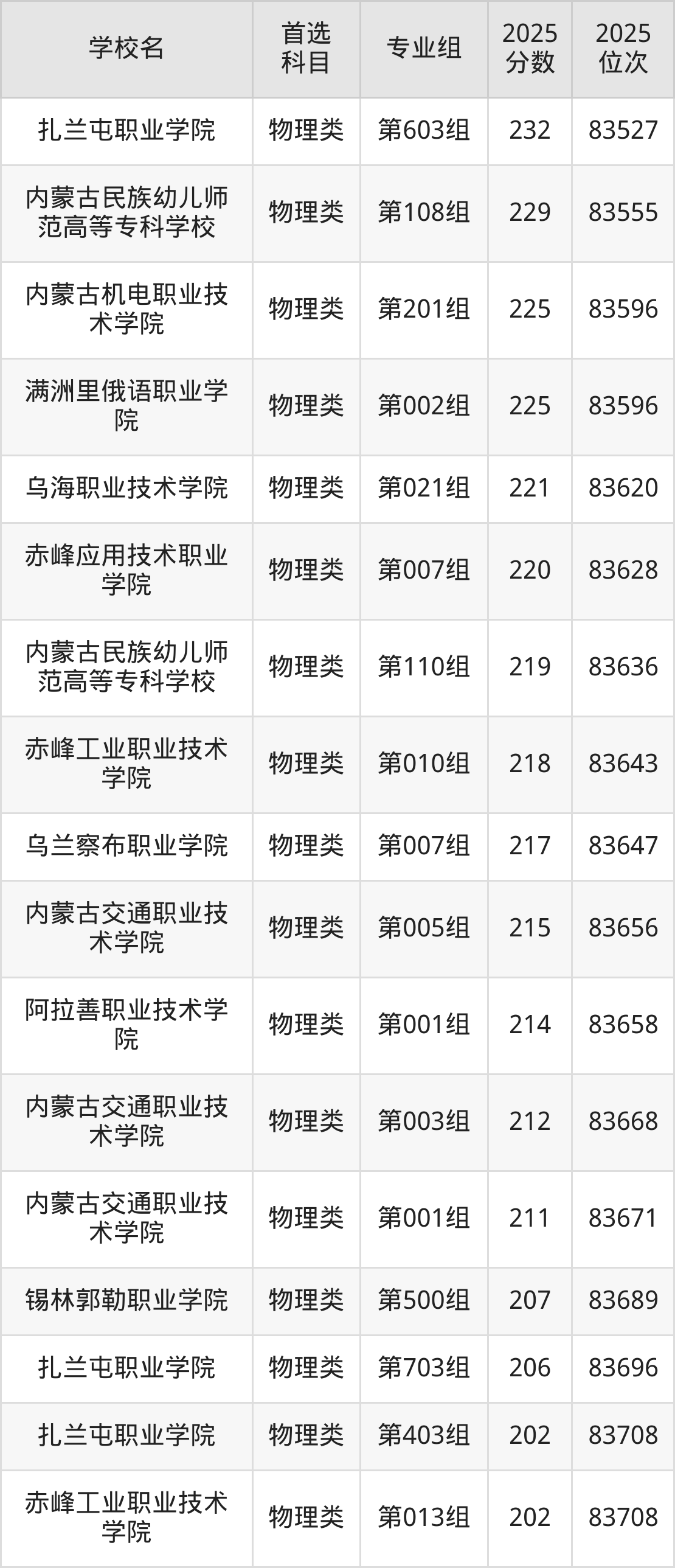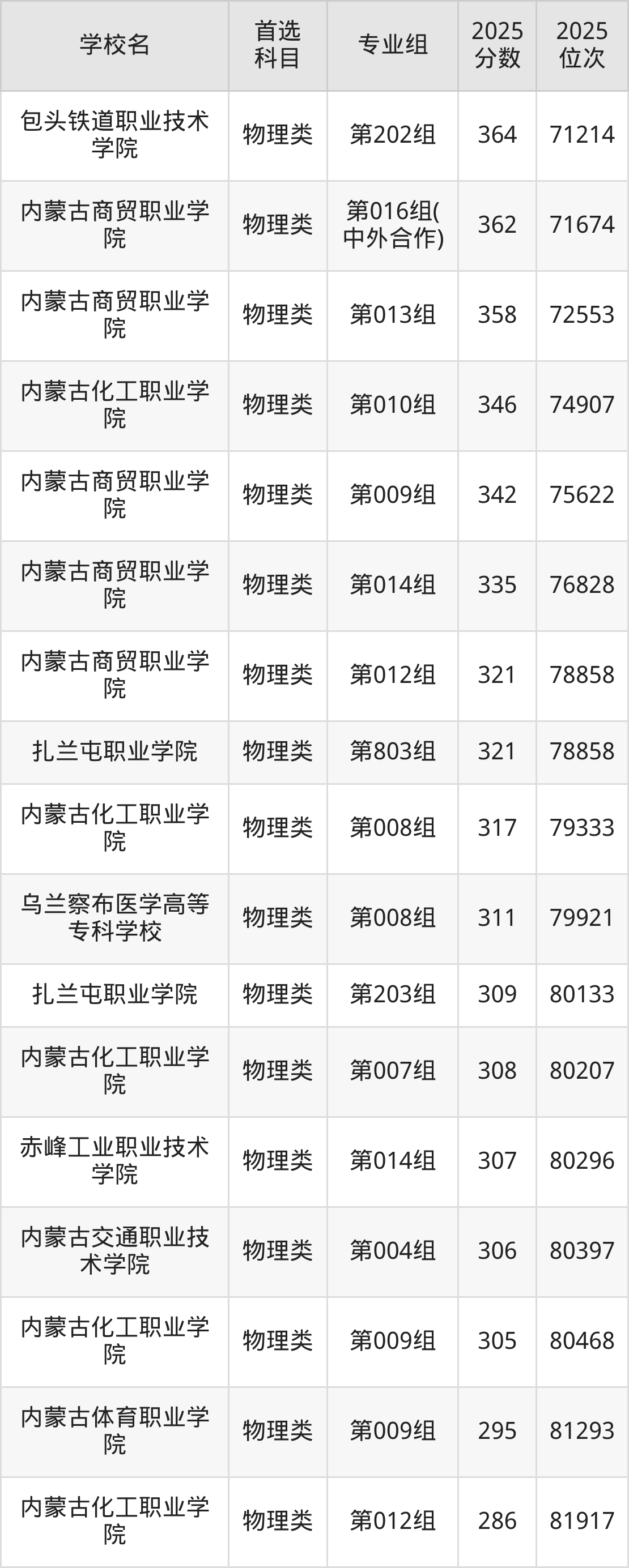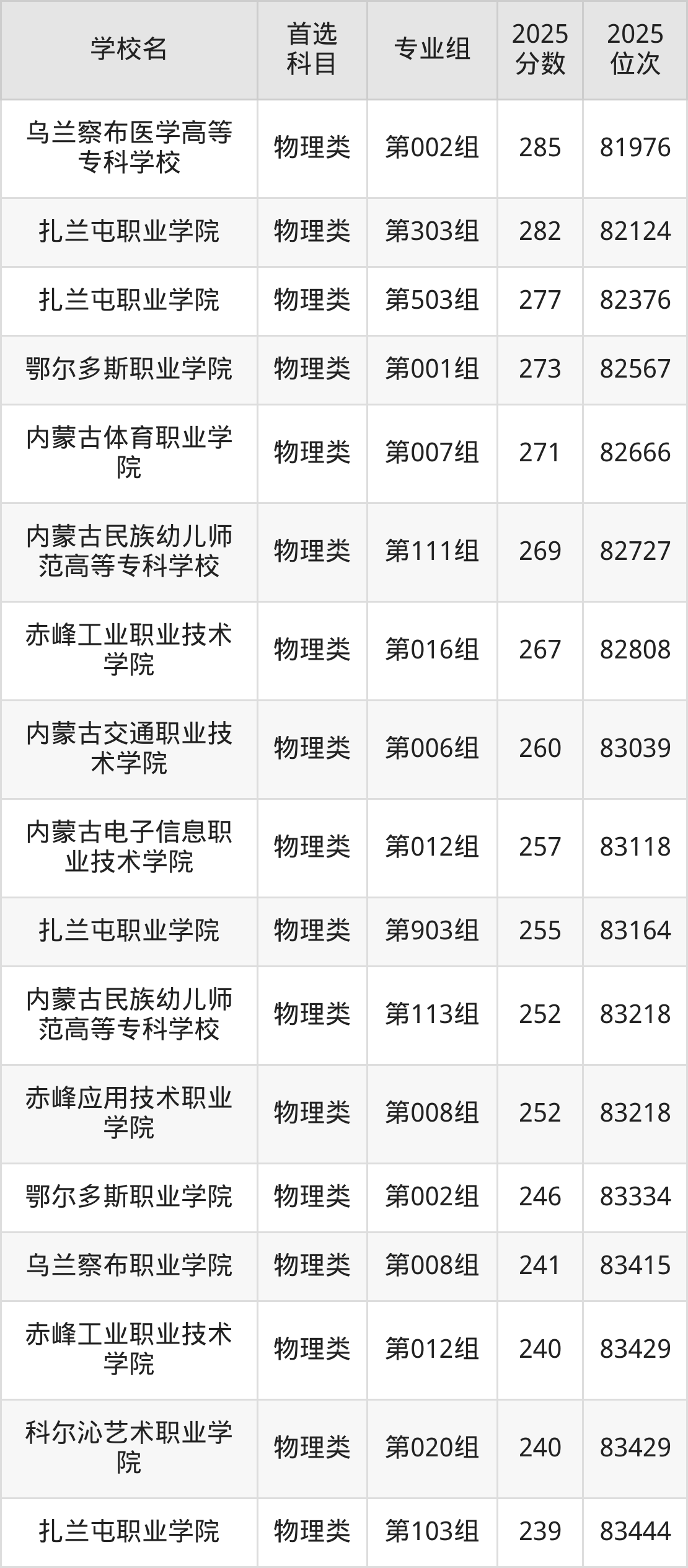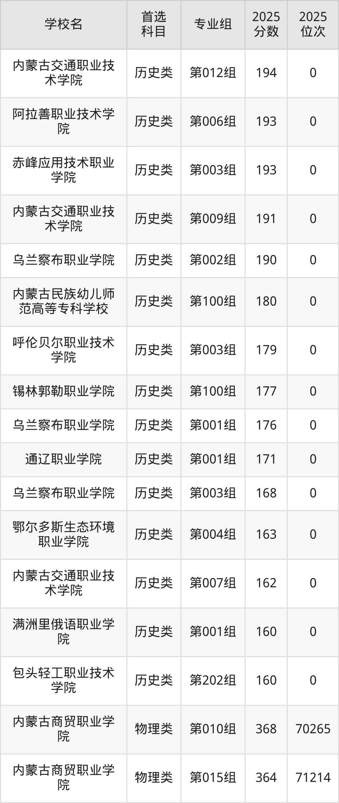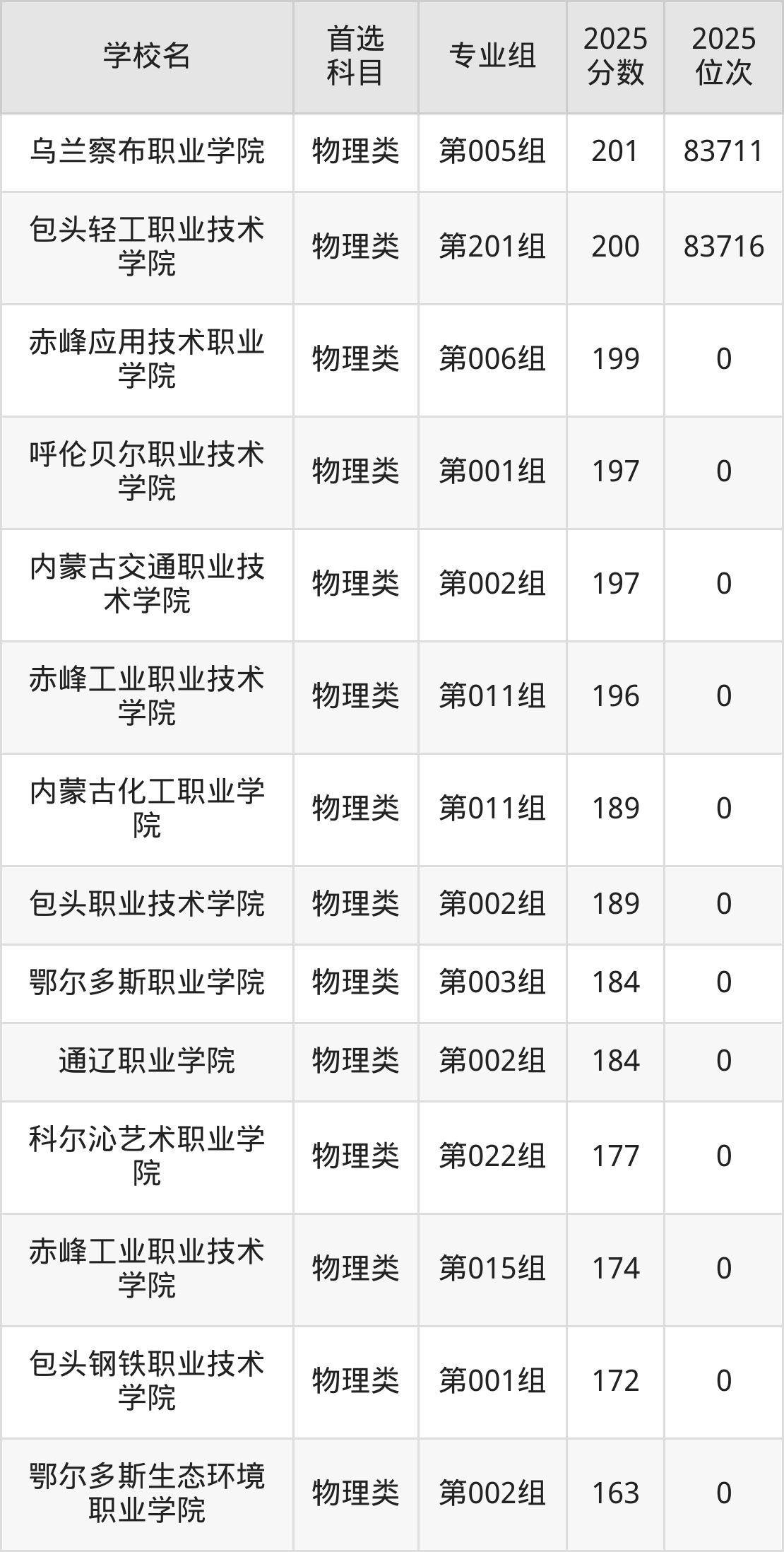2025年一共有25所公办大专在内蒙古物理类招生,包含了67个专业组,录取分数线从163分到368分不等。下面分别展示内蒙古自治区分数线最高、最低的五个院校专业组。
