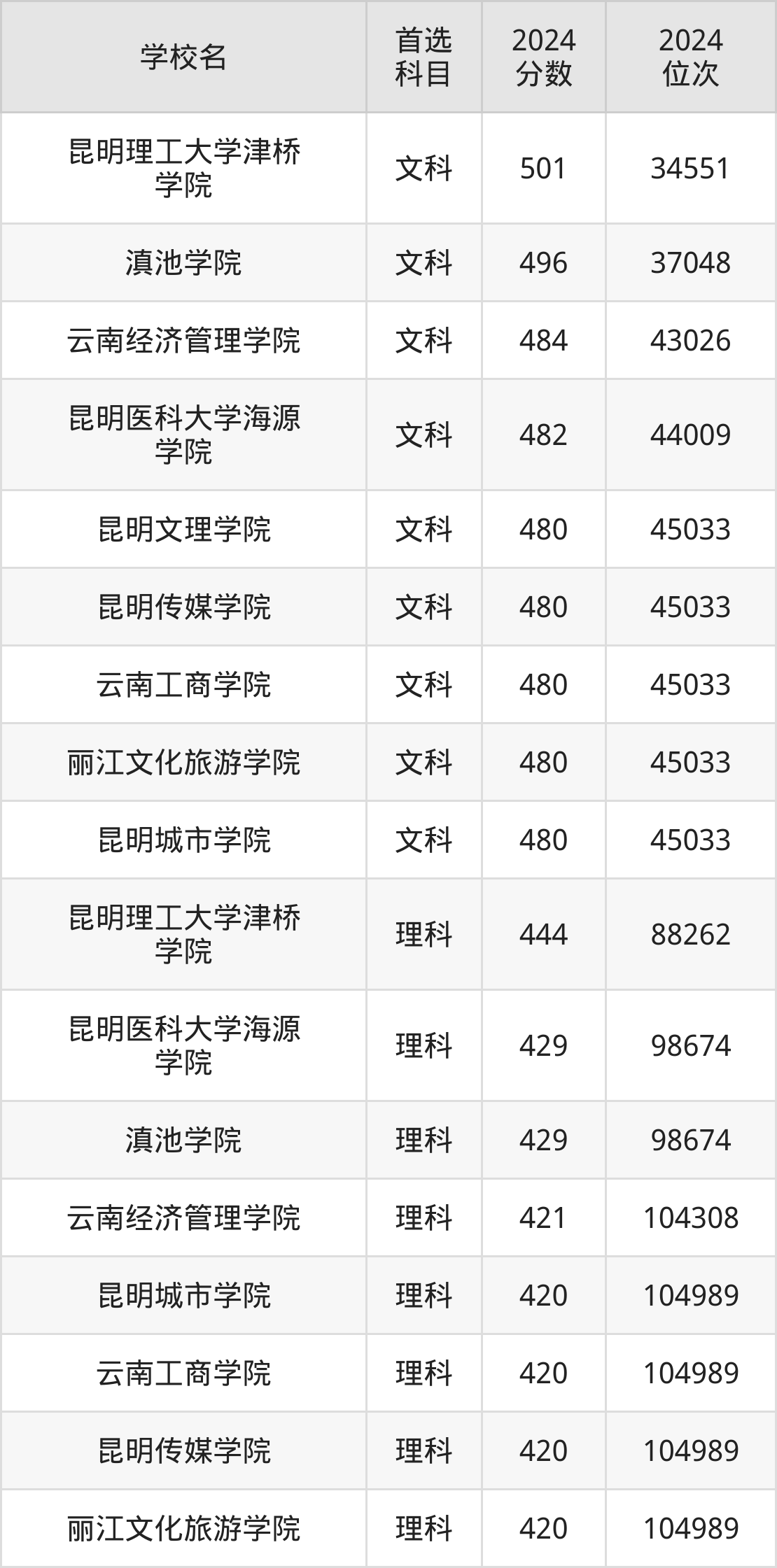 2024年一共有9所民办本科在云南文科招生,录取分数线从480分到501分不等,对应最低位次从45033名到34551名。下面分别展示云南省分数线最低的五个院校。