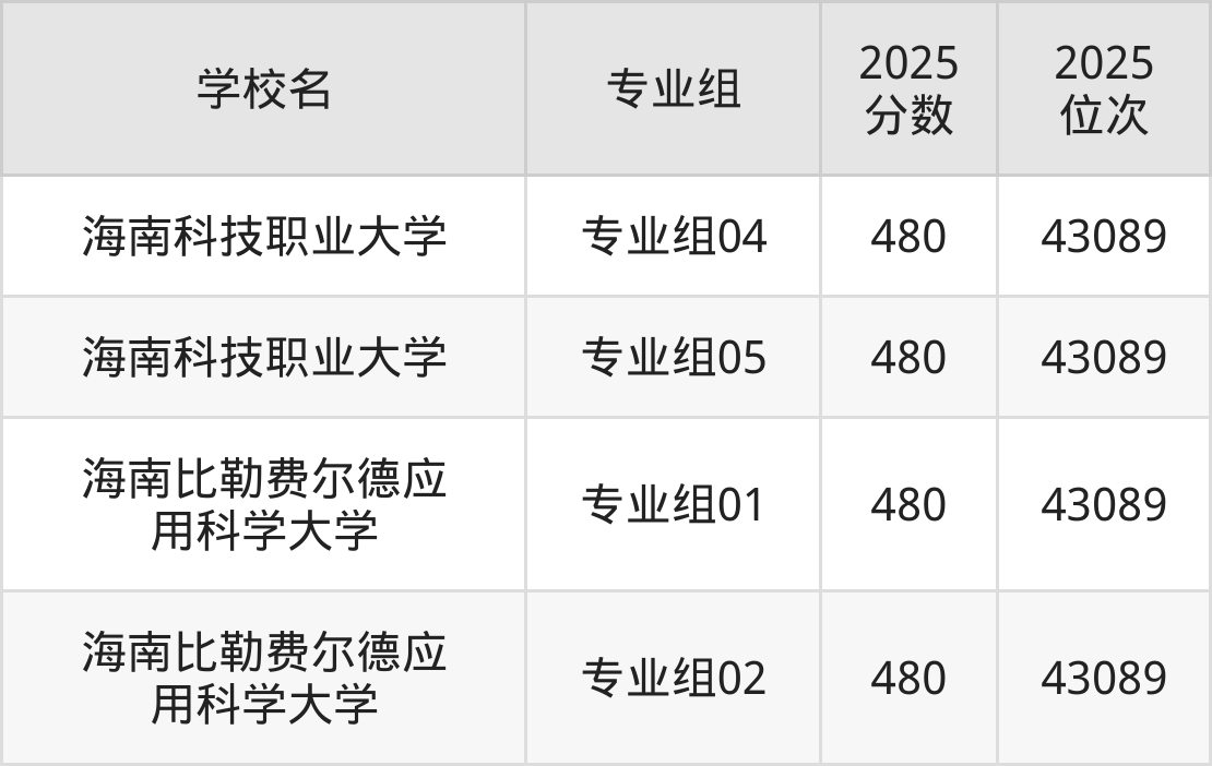2025年一共有2所二本理工大学在海南招生,包含了4个专业组,录取分数线480分,对应最低位次43089名。