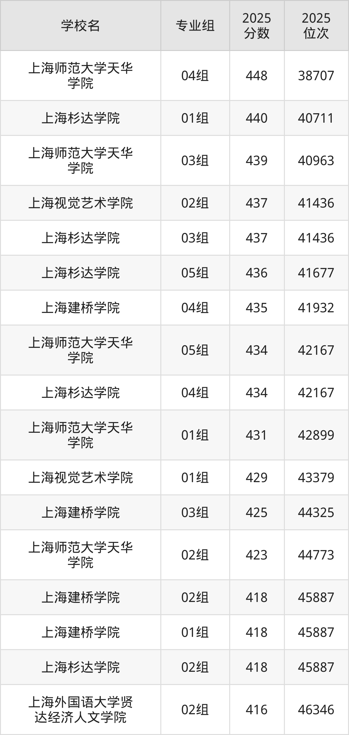 2025年一共有7所民办本科在上海招生,包含了29个专业组,录取分数线从402分到448分不等,对应最低位次从49276名到38707名。下面分别展示上海市分数线最高、最低的五个院校专业组。