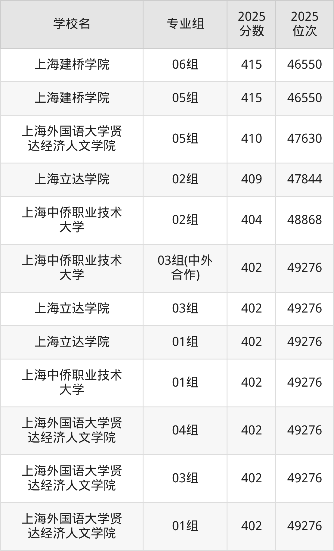 (2)上海中侨职业技术大学(01):402分、49276名;