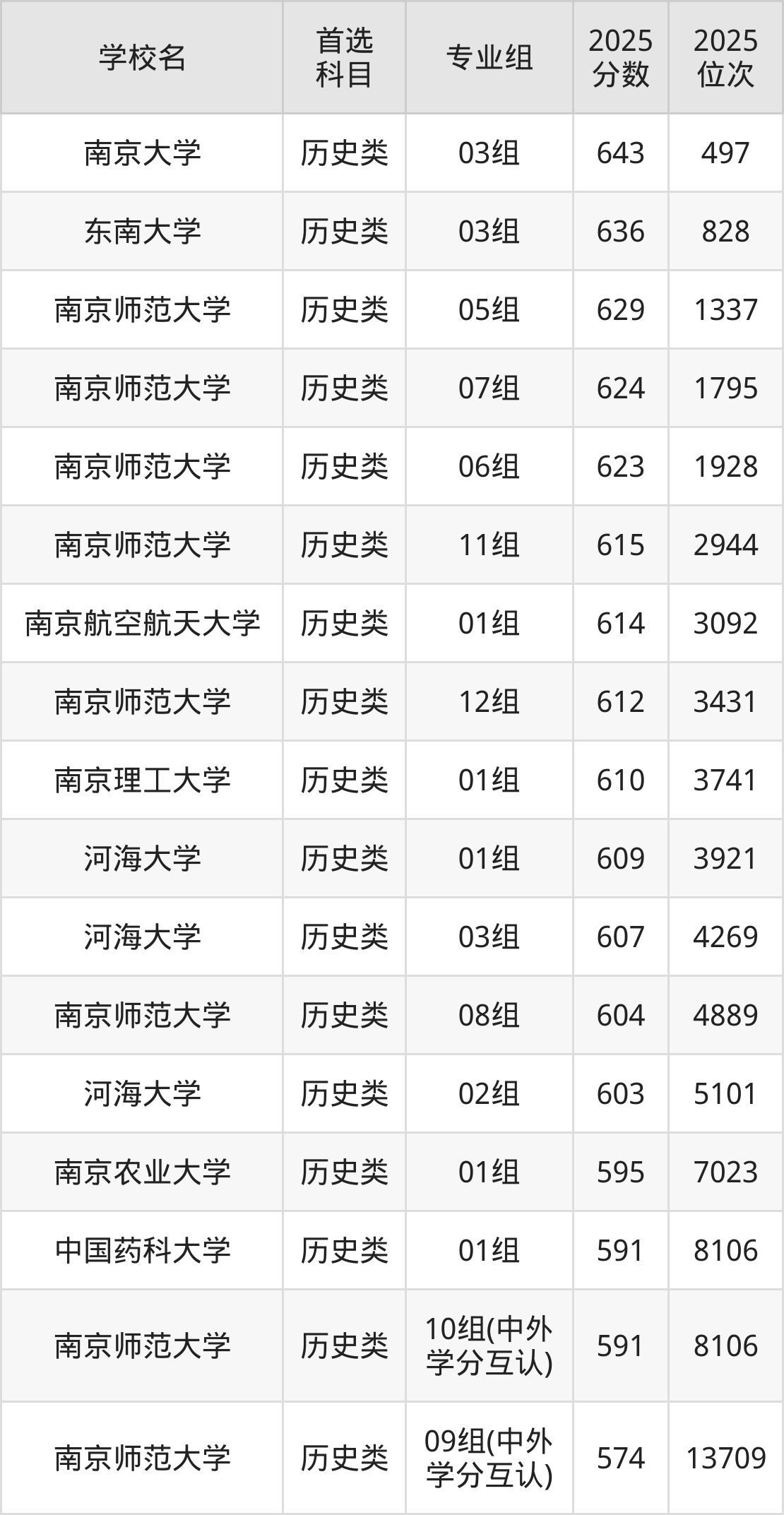 2025年一共有8所211在南京历史类招生,包含了17个专业组,录取分数线从574分到643分不等,对应最低位次从13709名到497名。下面分别展示南京市分数线最高、最低的五个院校专业组。