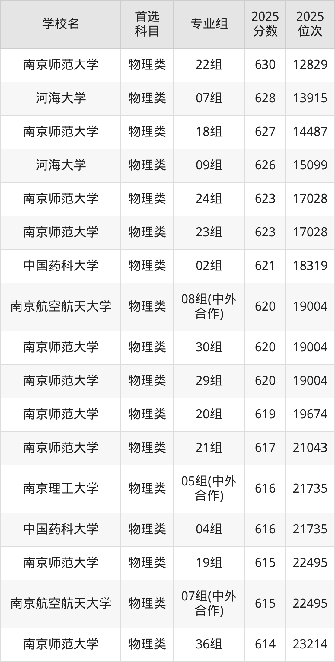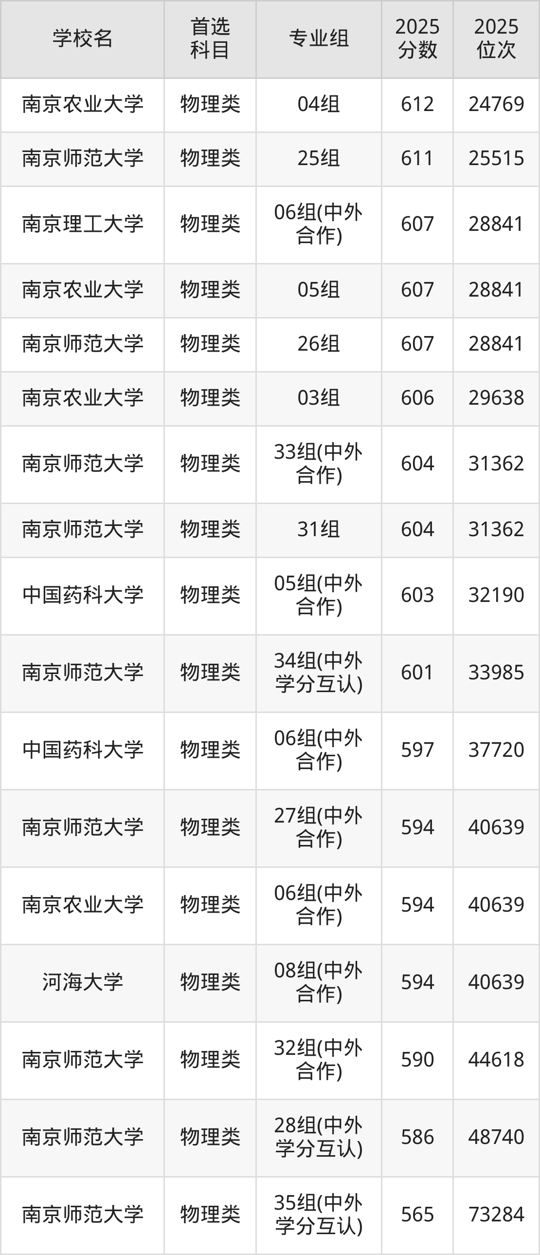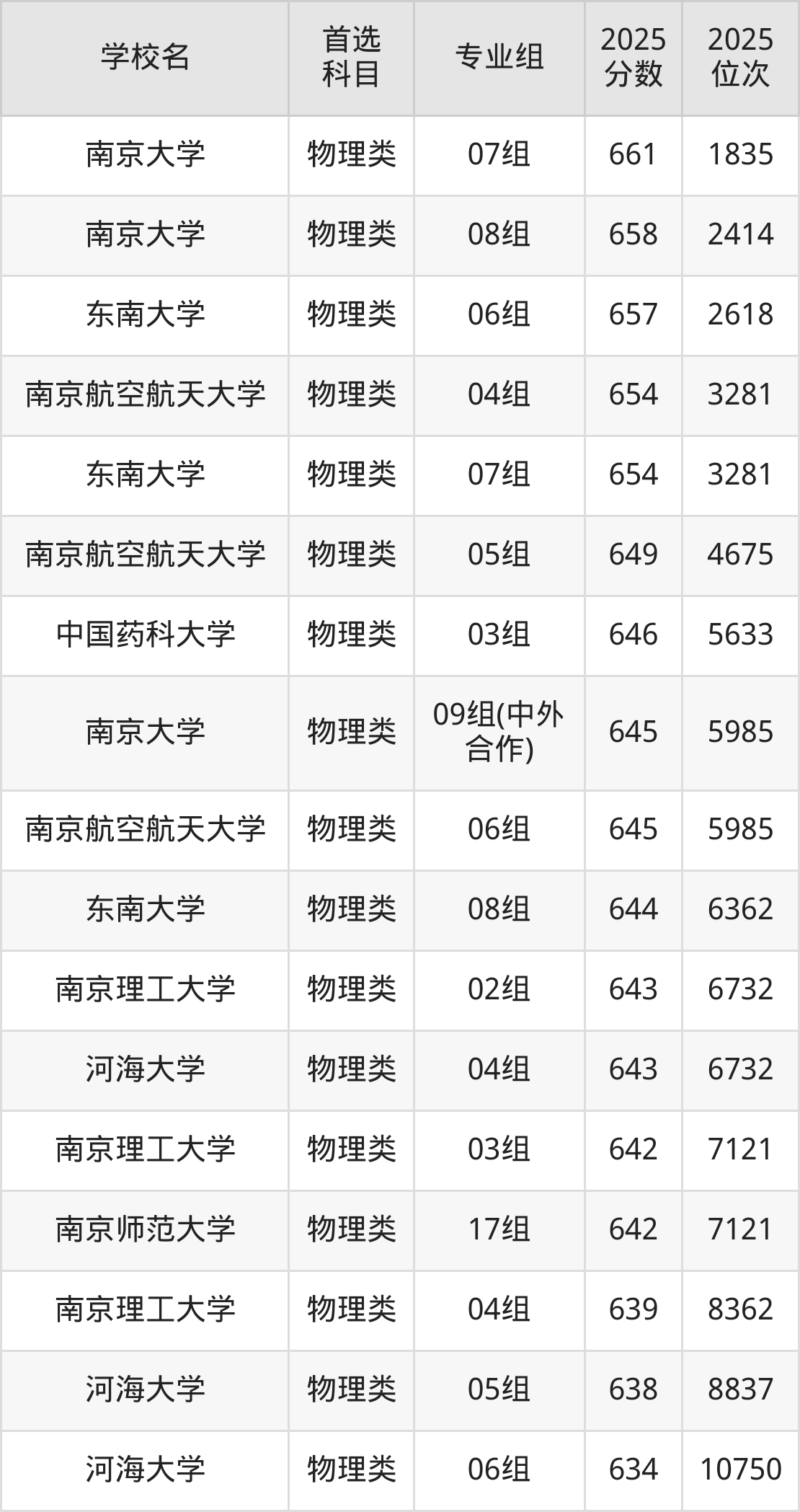 2025年一共有8所211在南京物理类招生,包含了51个专业组,录取分数线从565分到661分不等,对应最低位次从73284名到1835名。下面分别展示南京市分数线最高、最低的五个院校专业组。