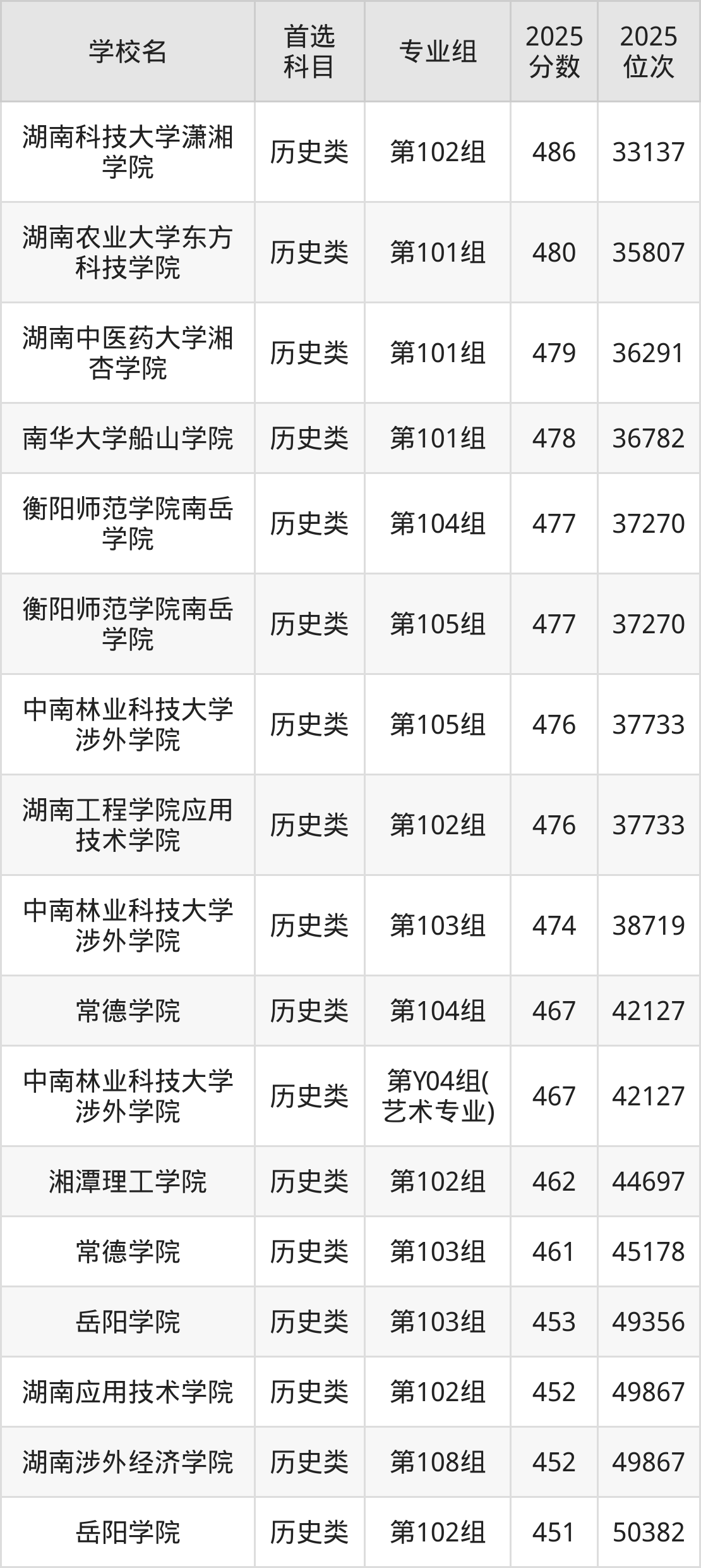 2025年一共有13所民办本科在湖南历史类招生,包含了18个专业组,录取分数线从447分到486分不等,对应最低位次从52545名到33137名。下面分别展示湖南省分数线最高、最低的五个院校专业组。