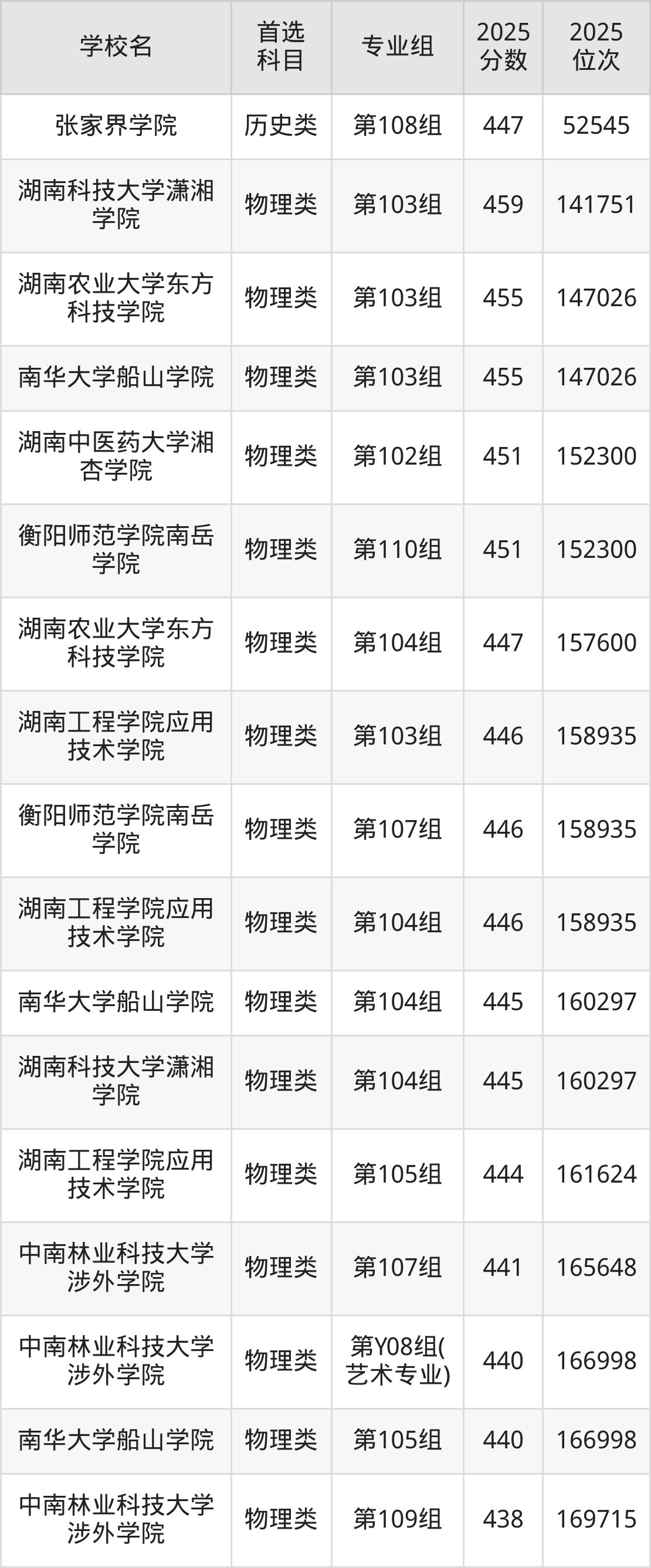 2025年湖南民办本科最低录取分数线是447分,收分最低的学校为张家界学院第108组。