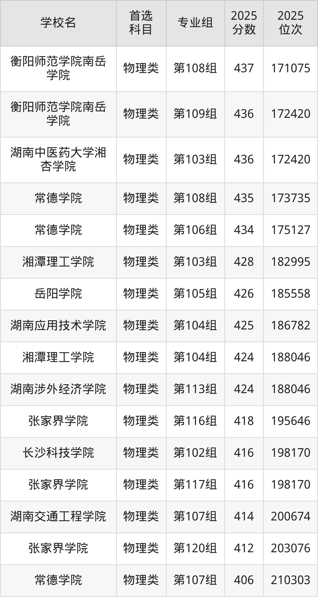 2025年一共有15所民办本科在湖南物理类招生,包含了32个专业组,录取分数线从406分到459分不等,对应最低位次从210303名到141751名。下面分别展示湖南省分数线最高、最低的五个院校专业组。