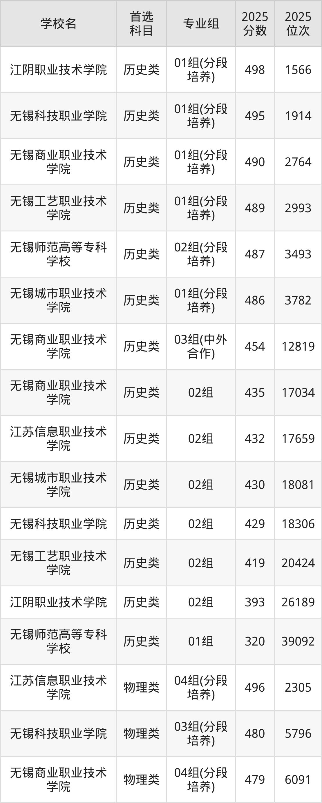 2025年无锡市公办大专录取分数线一览表完整版,请查看: