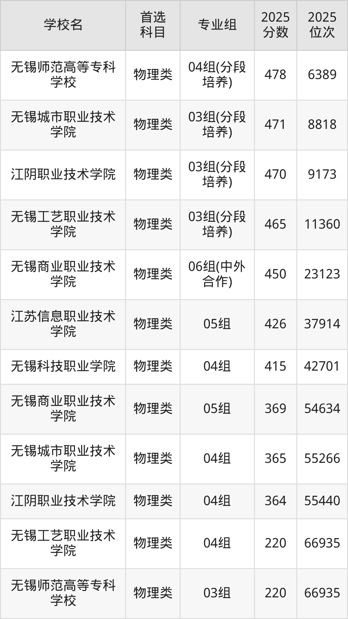 2025年一共有7所公办大专在无锡物理类招生,包含了15个专业组,录取分数线从220分到496分不等,对应最低位次从66935名到2305名。下面分别展示无锡市分数线最高、最低的五个院校专业组。