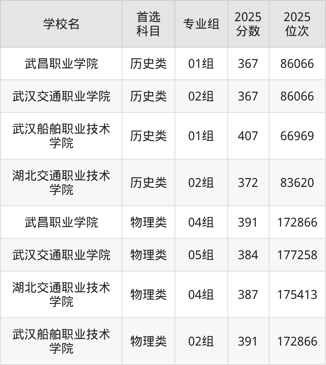 (4)武汉船舶职业技术学院02组:391分、172866名;