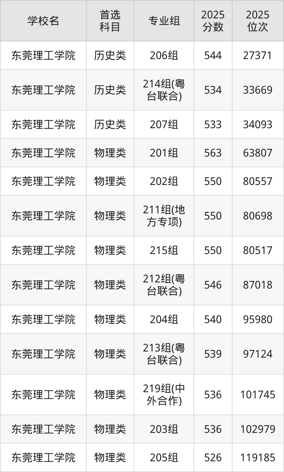 2025年一共有1所公办二本大学在东莞历史类招生,包含了3个专业组,录取分数线从533分到544分不等,对应最低位次从34093名到27371名。