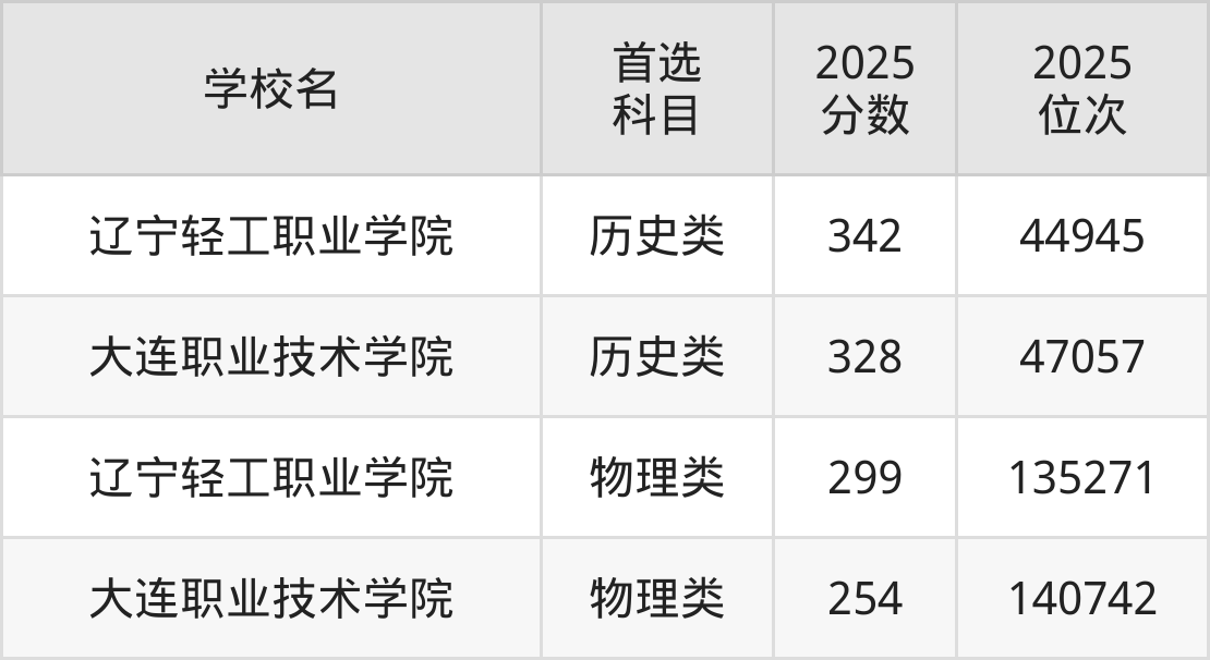 2025年一共有2所公办大专在大连物理类招生,录取分数线从254分到299分不等,对应最低位次从140742名到135271名。