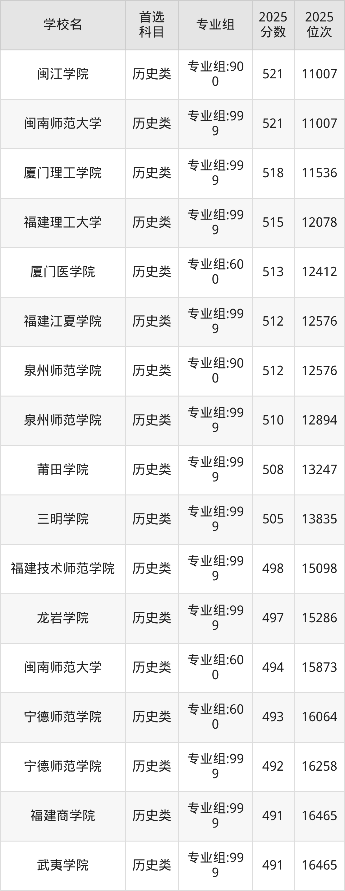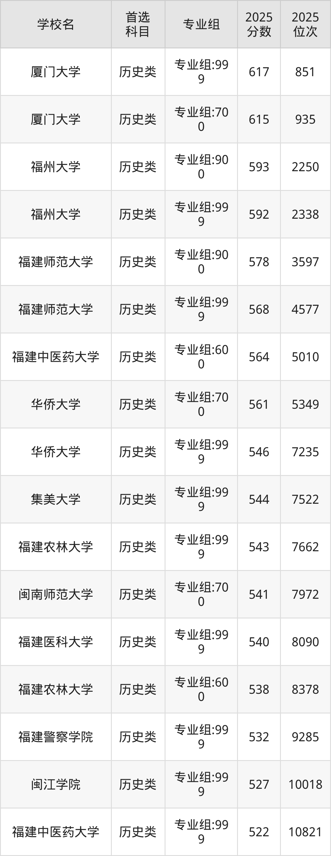 2025年一共有23所公办本科在福建历史类招生,包含了34个专业组,录取分数线从491分到617分不等,对应最低位次从16465名到851名。下面分别展示福建省分数线最高、最低的五个院校专业组。