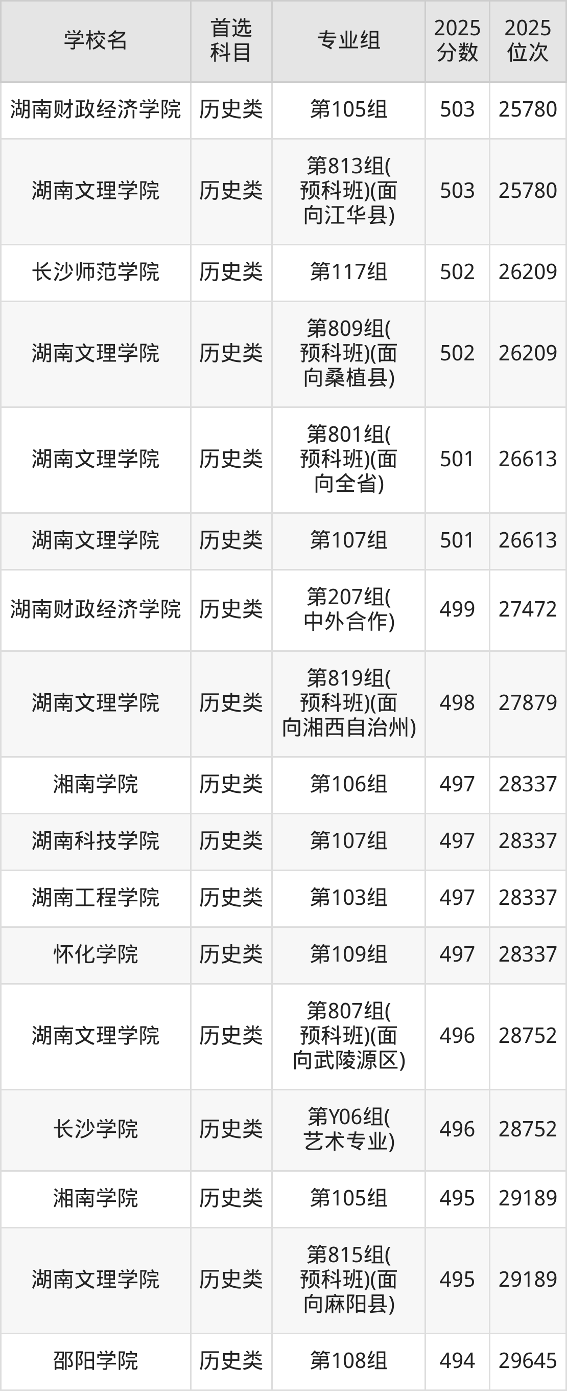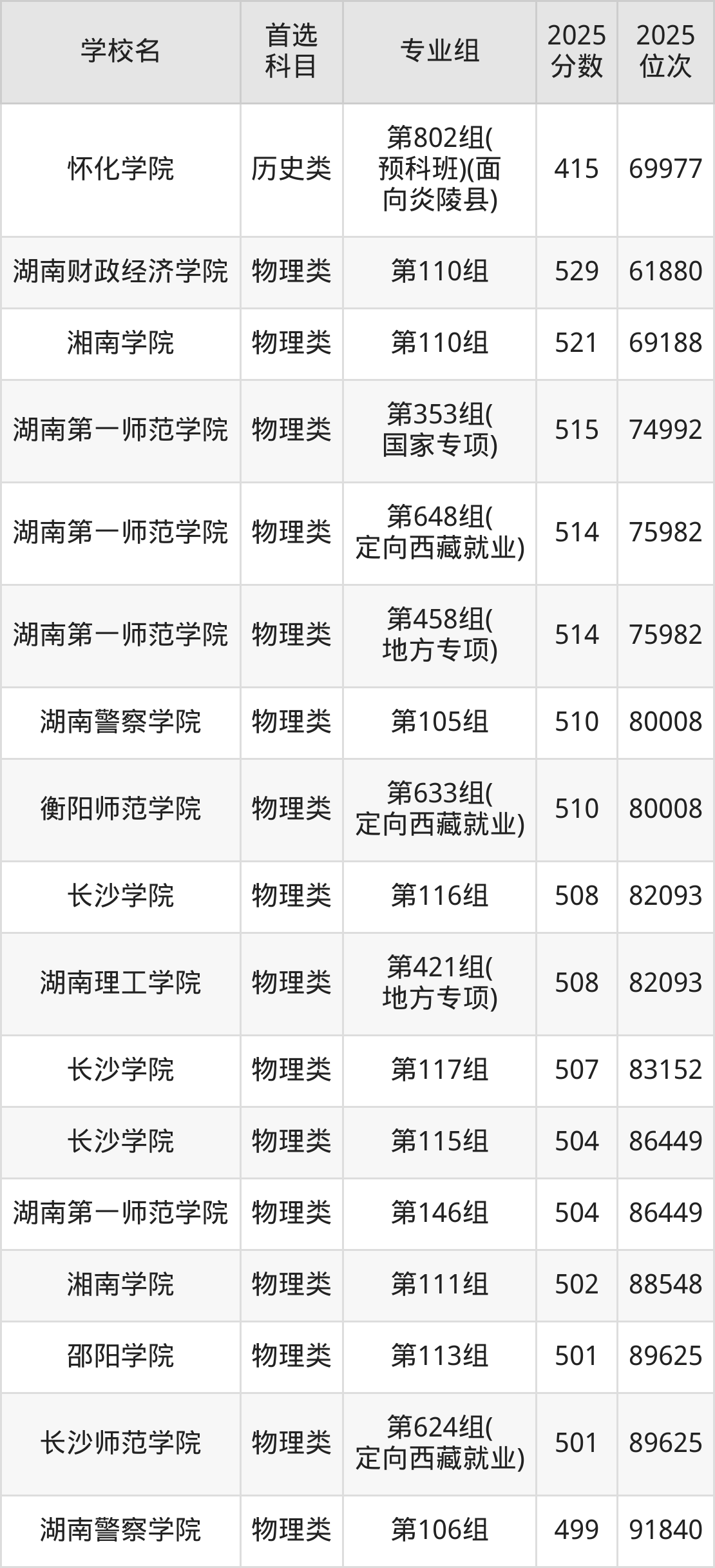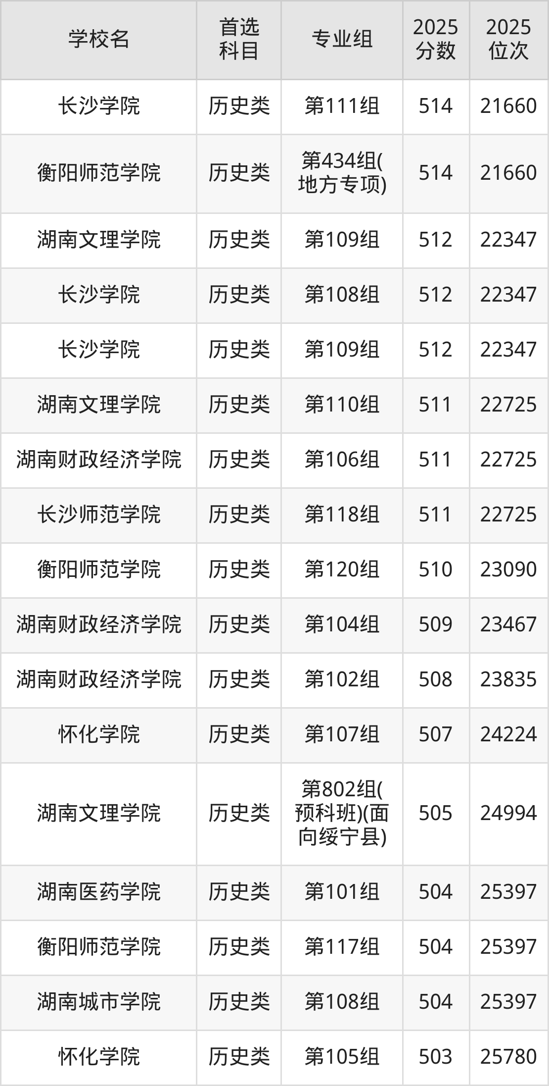2025年一共有33所二本大学在湖南历史类招生,包含了171个专业组,录取分数线从415分到554分不等,对应最低位次从69977名到9878名。下面分别展示湖南省分数线最高、最低的五个院校专业组。