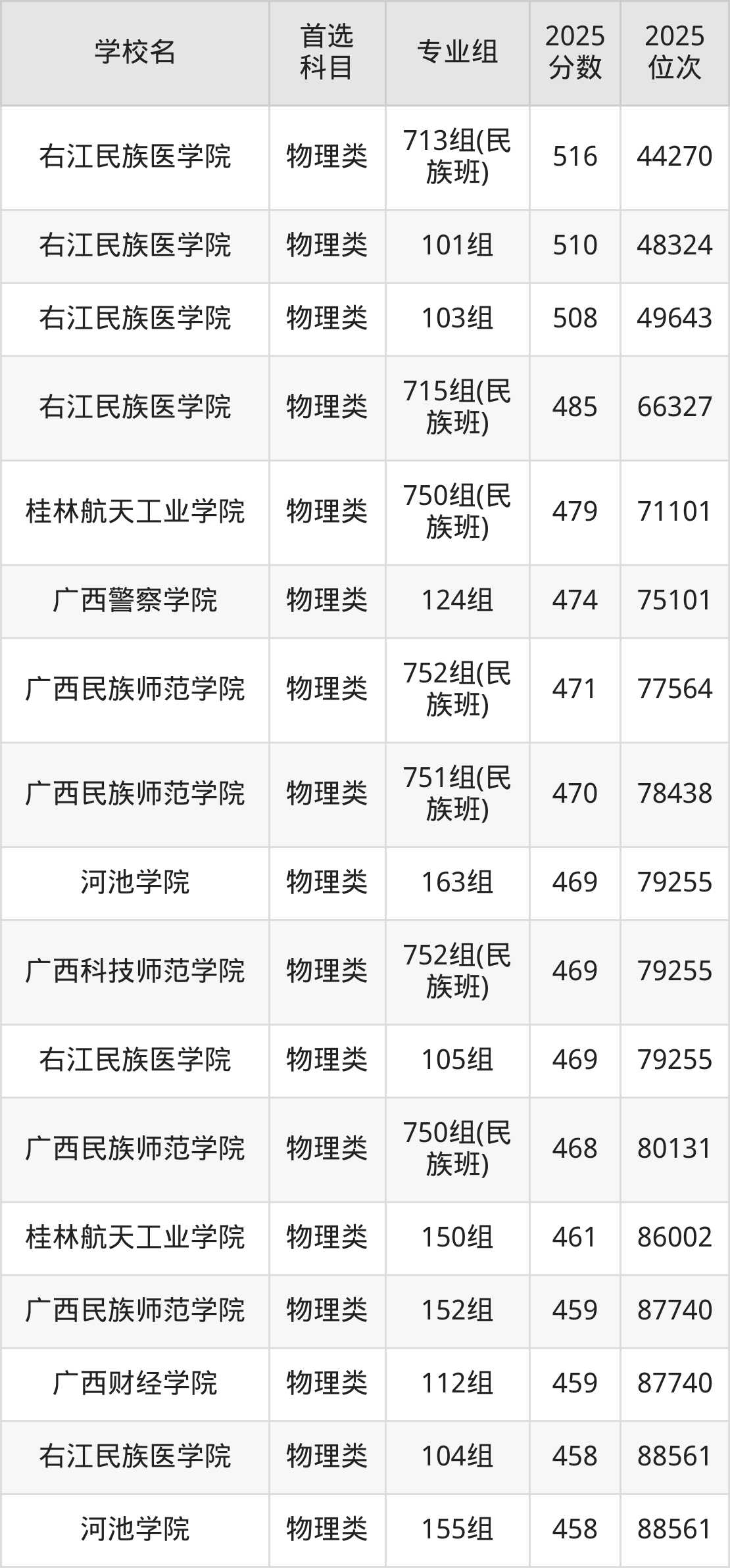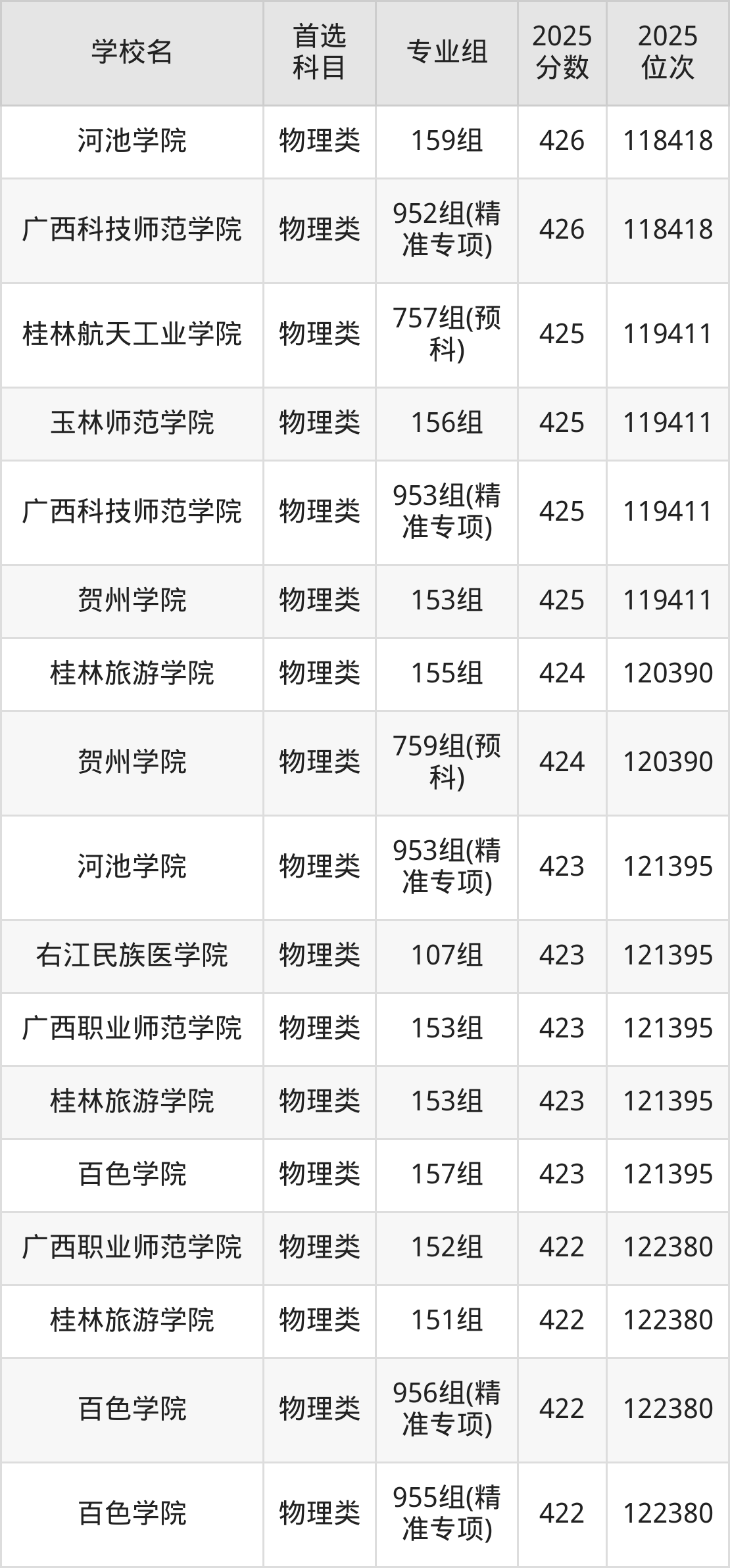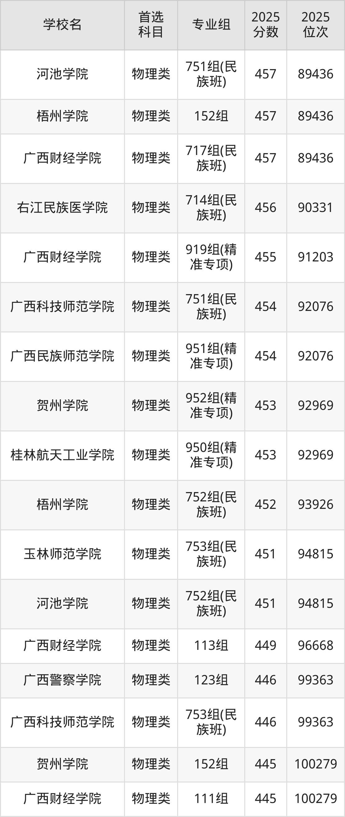 2025年一共有18所公办二本大学在广西物理类招生,包含了139个专业组,录取分数线从396分到542分不等,对应最低位次从148587名到28668名。下面分别展示广西壮族自治区分数线最高、最低的五个院校专业组。