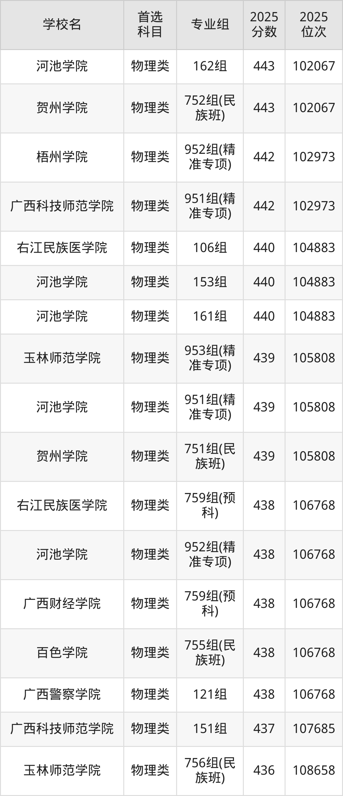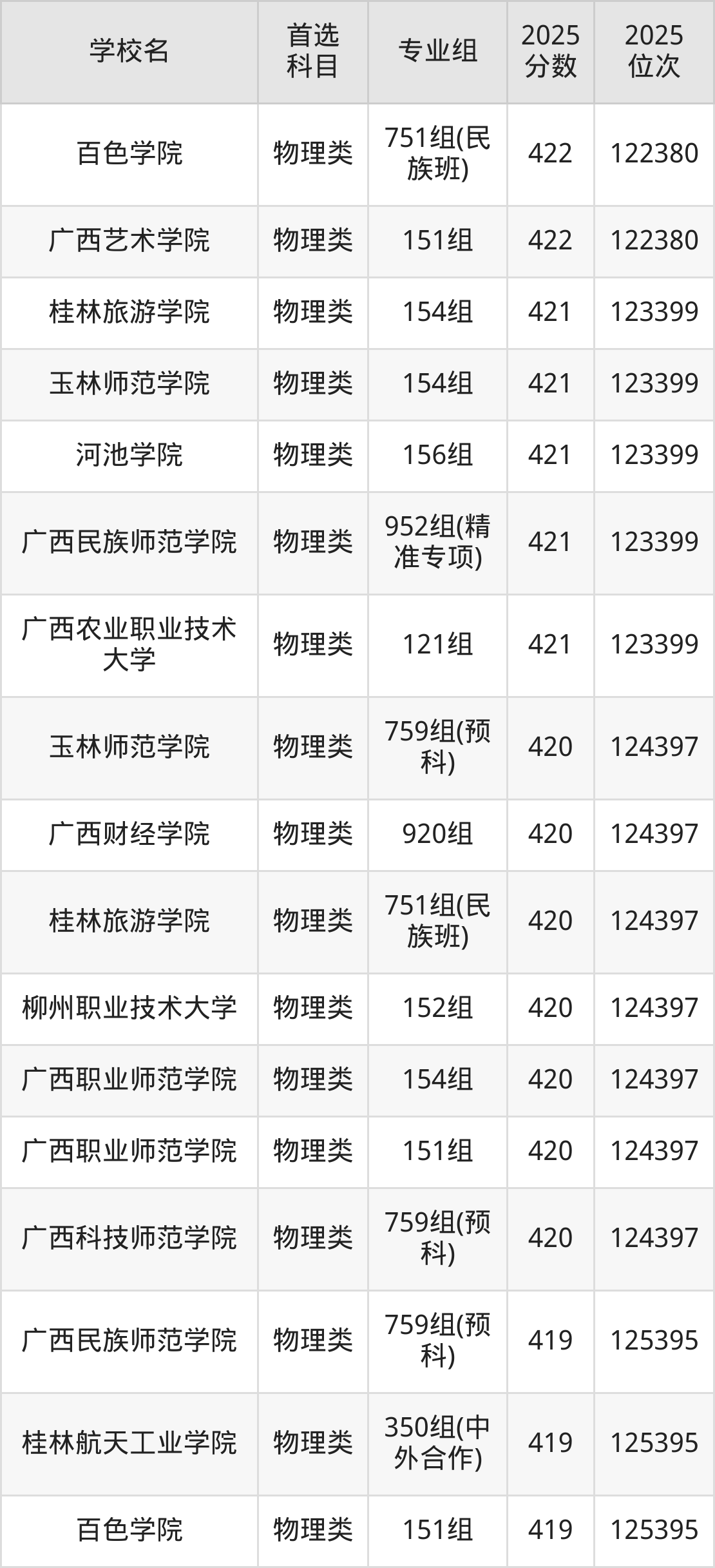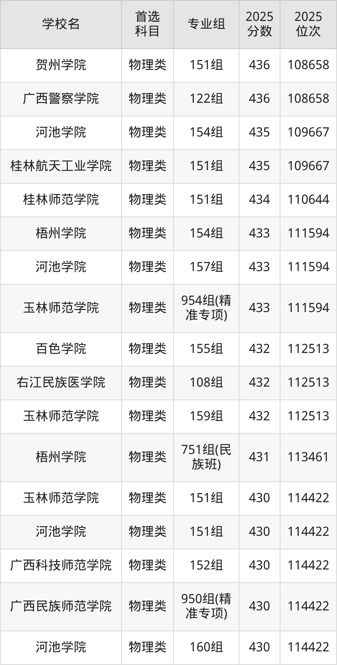 2025年一共有18所公办二本大学在广西物理类招生,包含了139个专业组,录取分数线从396分到542分不等,对应最低位次从148587名到28668名。下面分别展示广西壮族自治区分数线最高、最低的五个院校专业组。