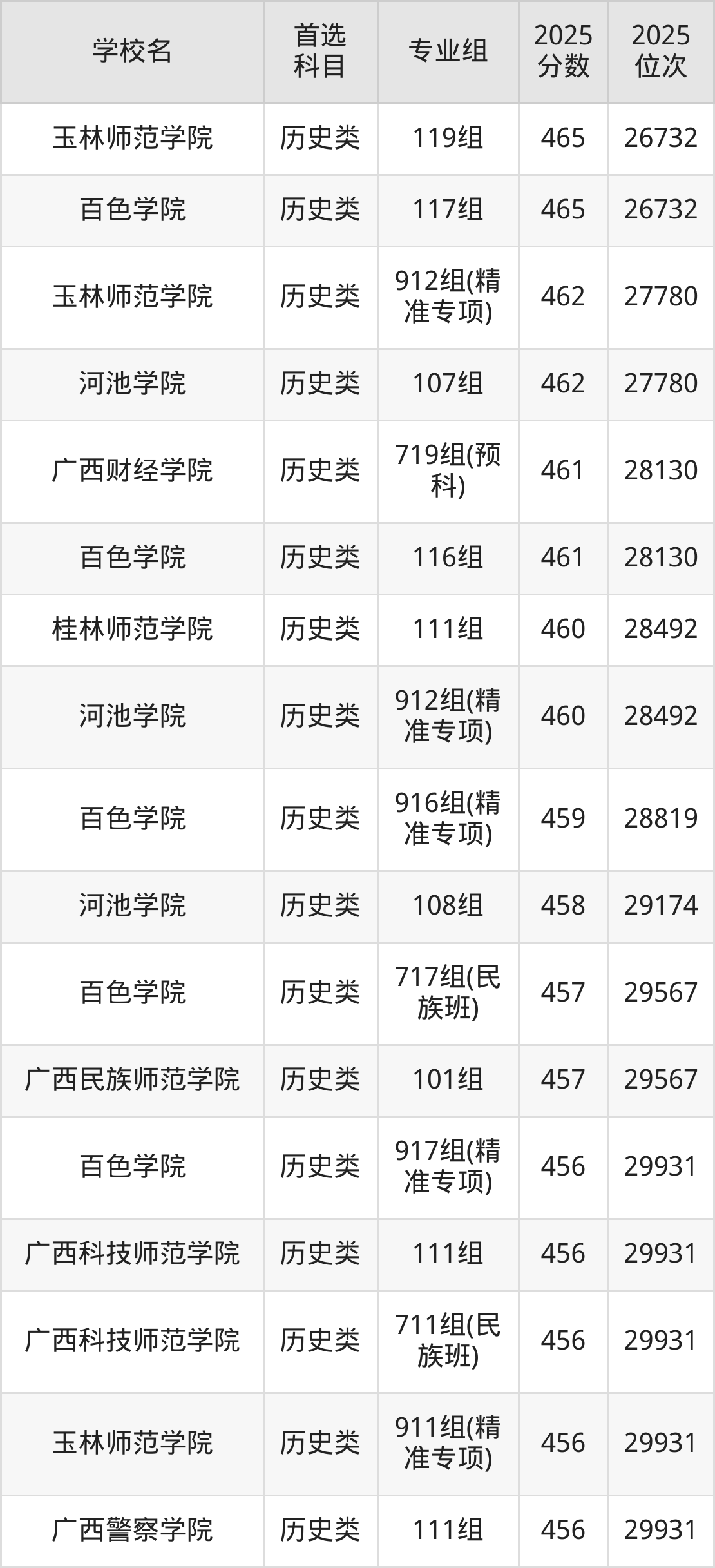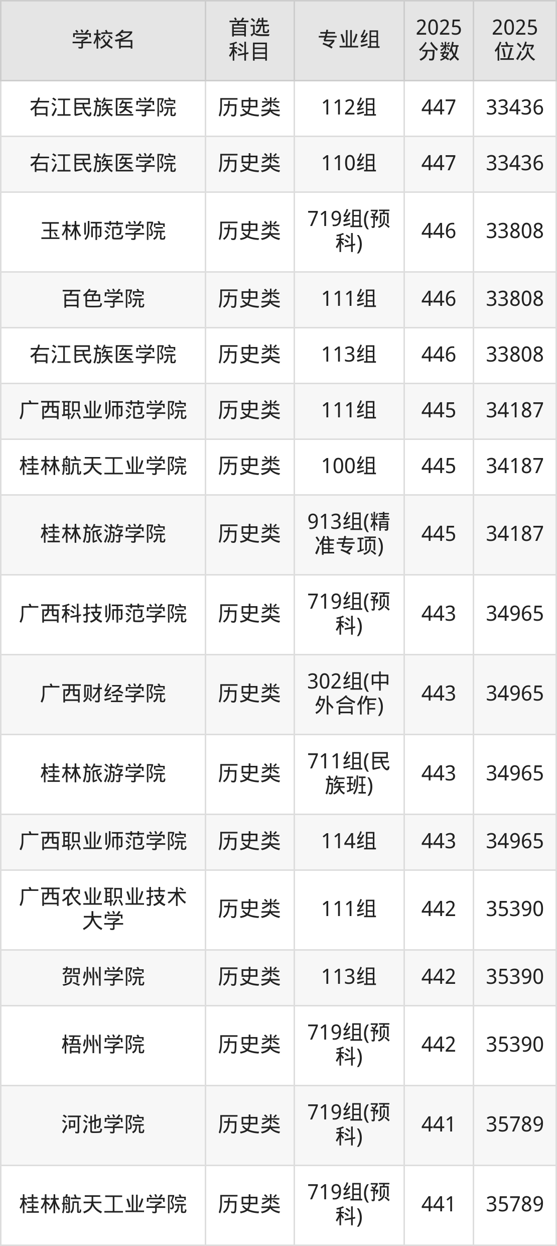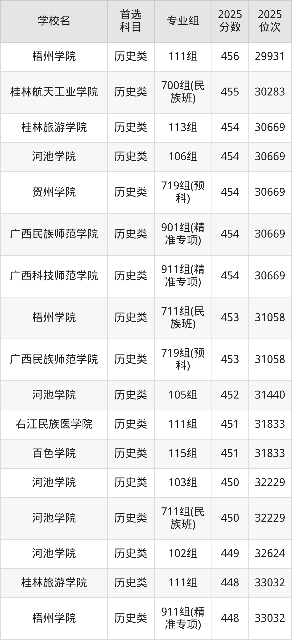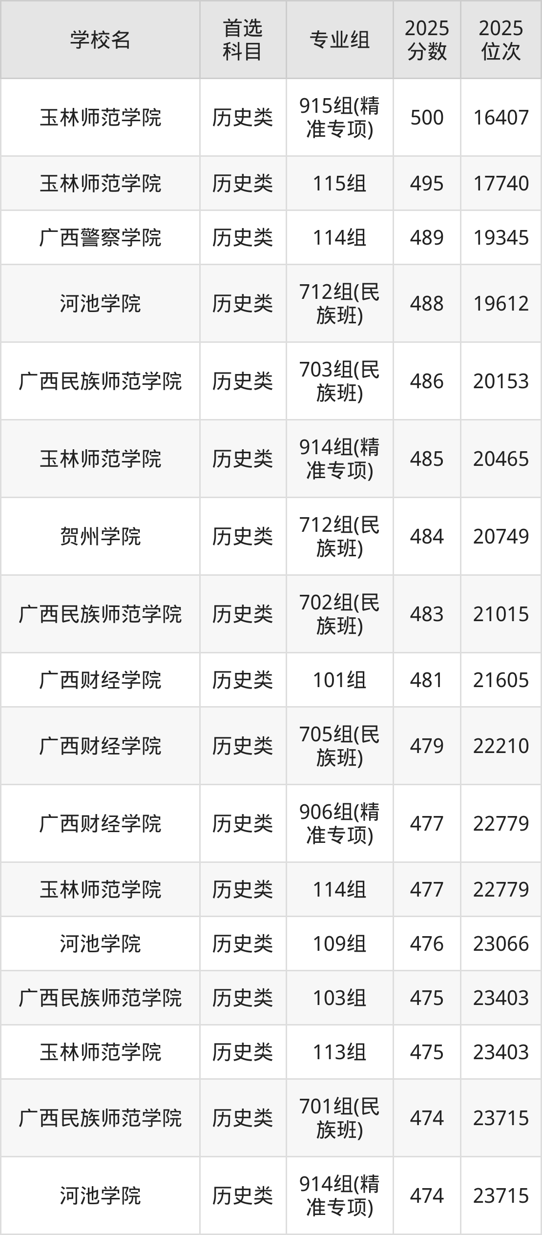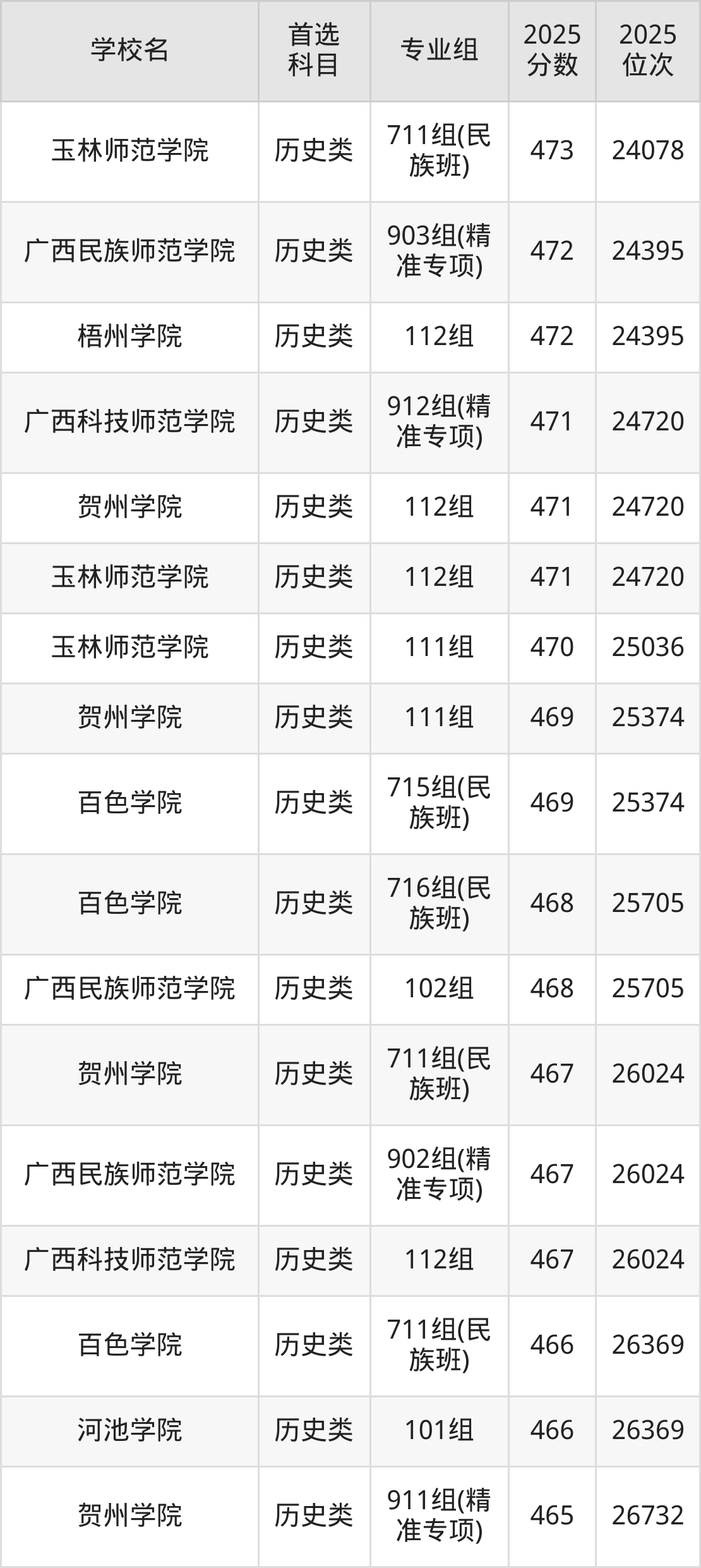 2025年一共有18所公办二本大学在广西历史类招生,包含了101个专业组,录取分数线从428分到500分不等,对应最低位次从41254名到16407名。下面分别展示广西壮族自治区分数线最高、最低的五个院校专业组。