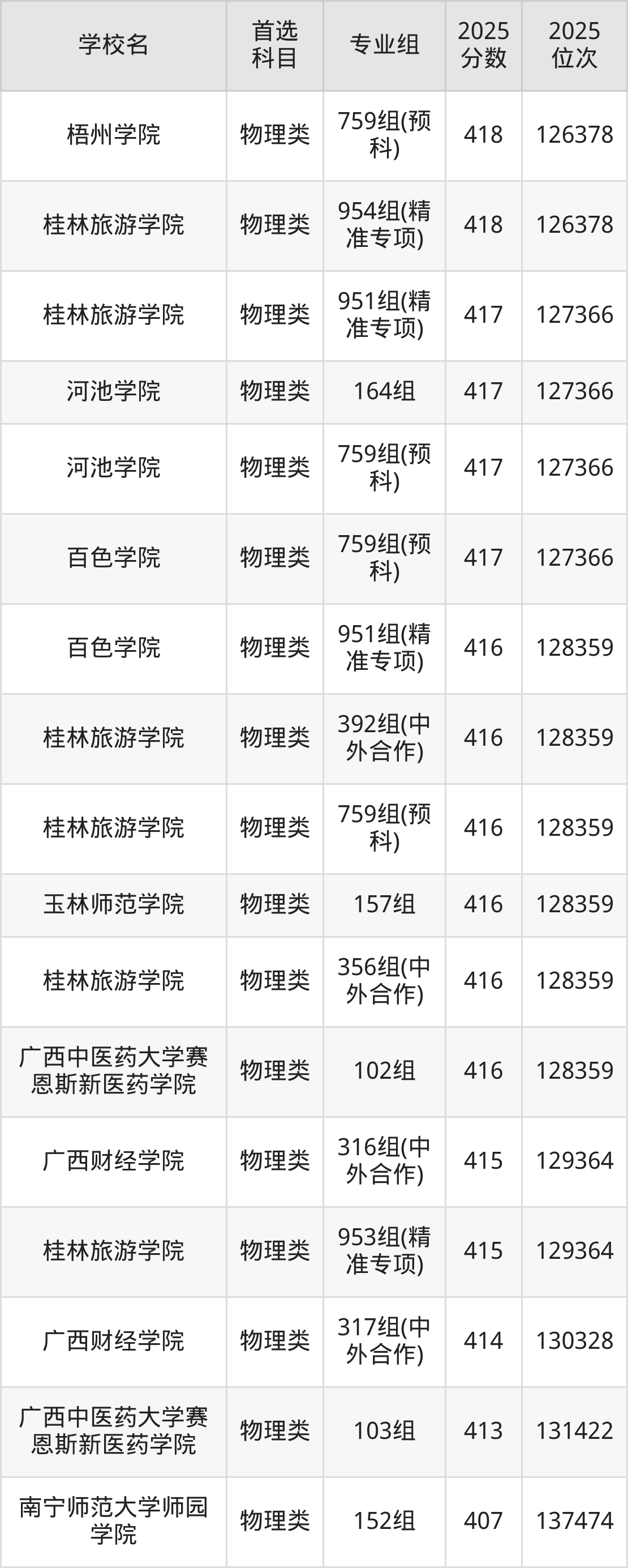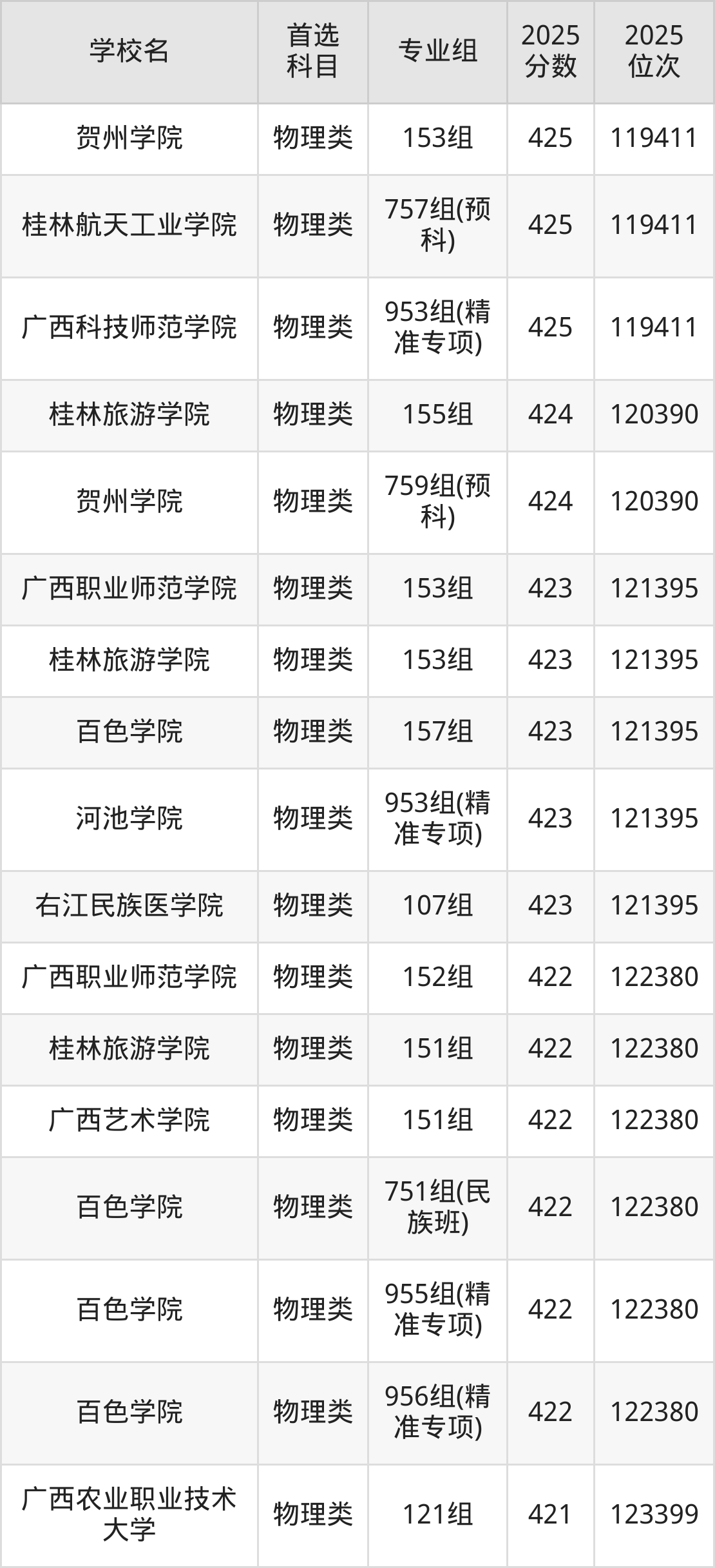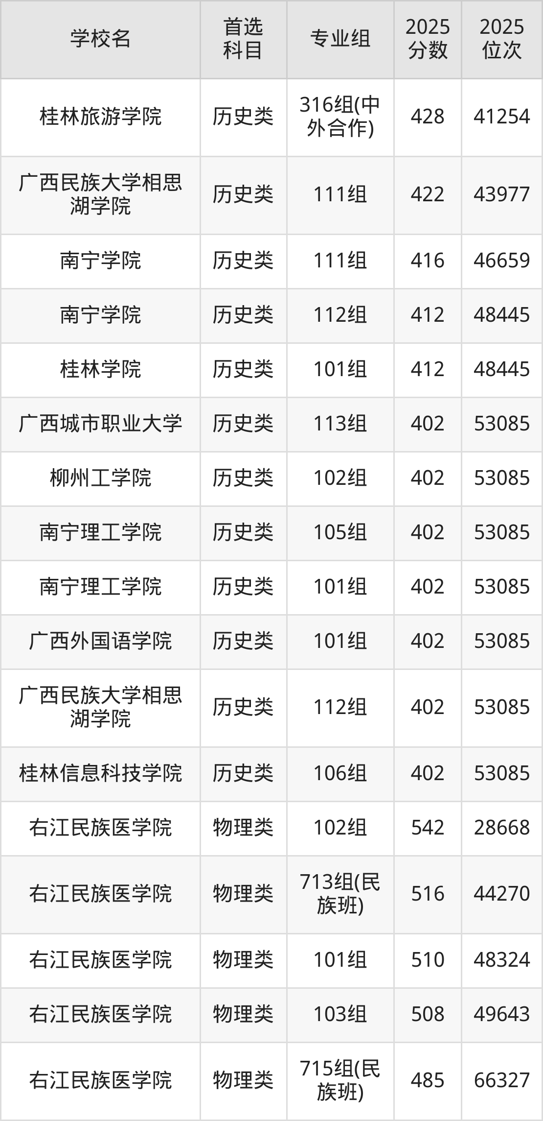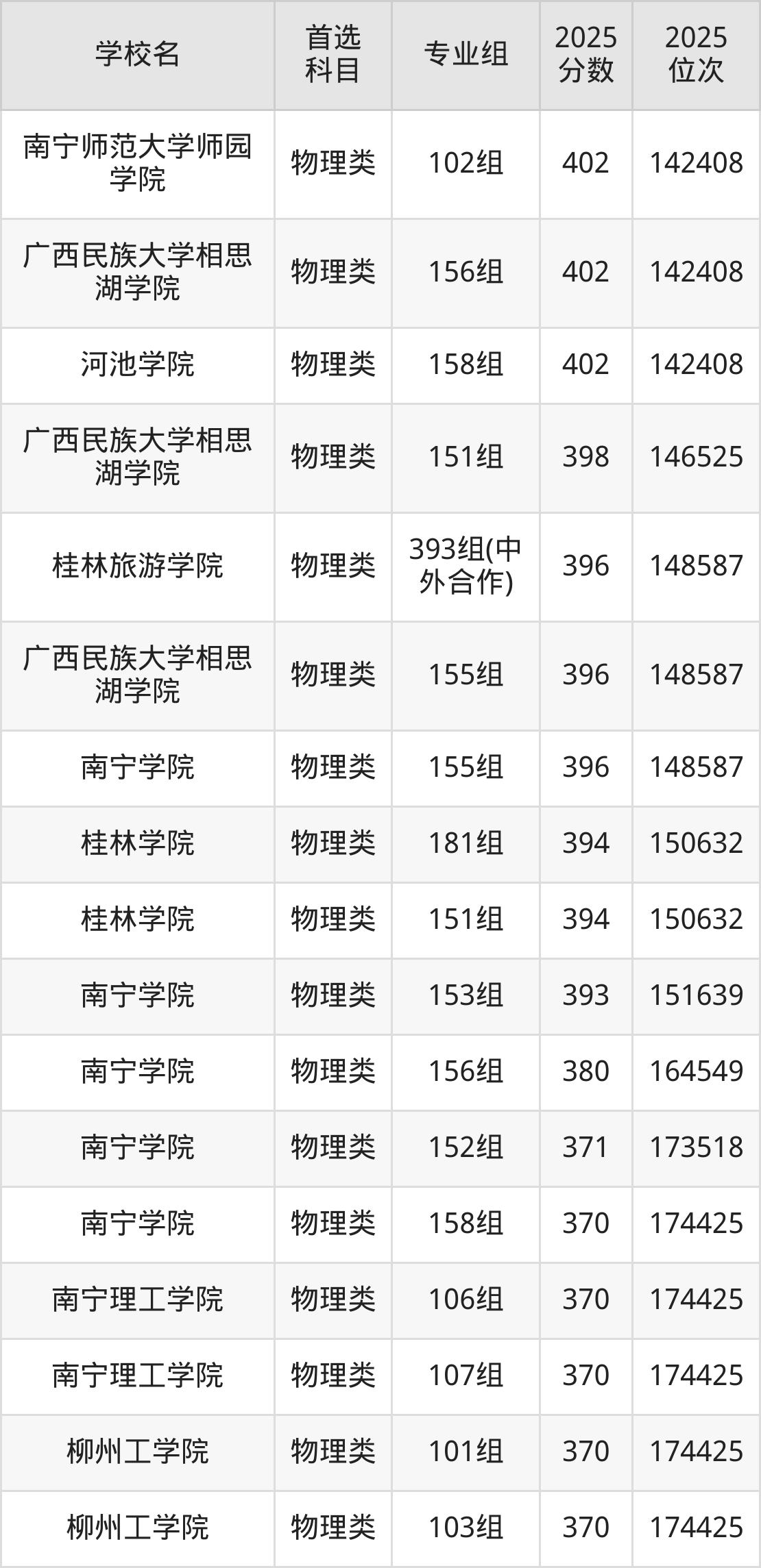 2025年广西二本大学最低录取分数线是402分,收分最低的学校为广西城市职业大学113组。