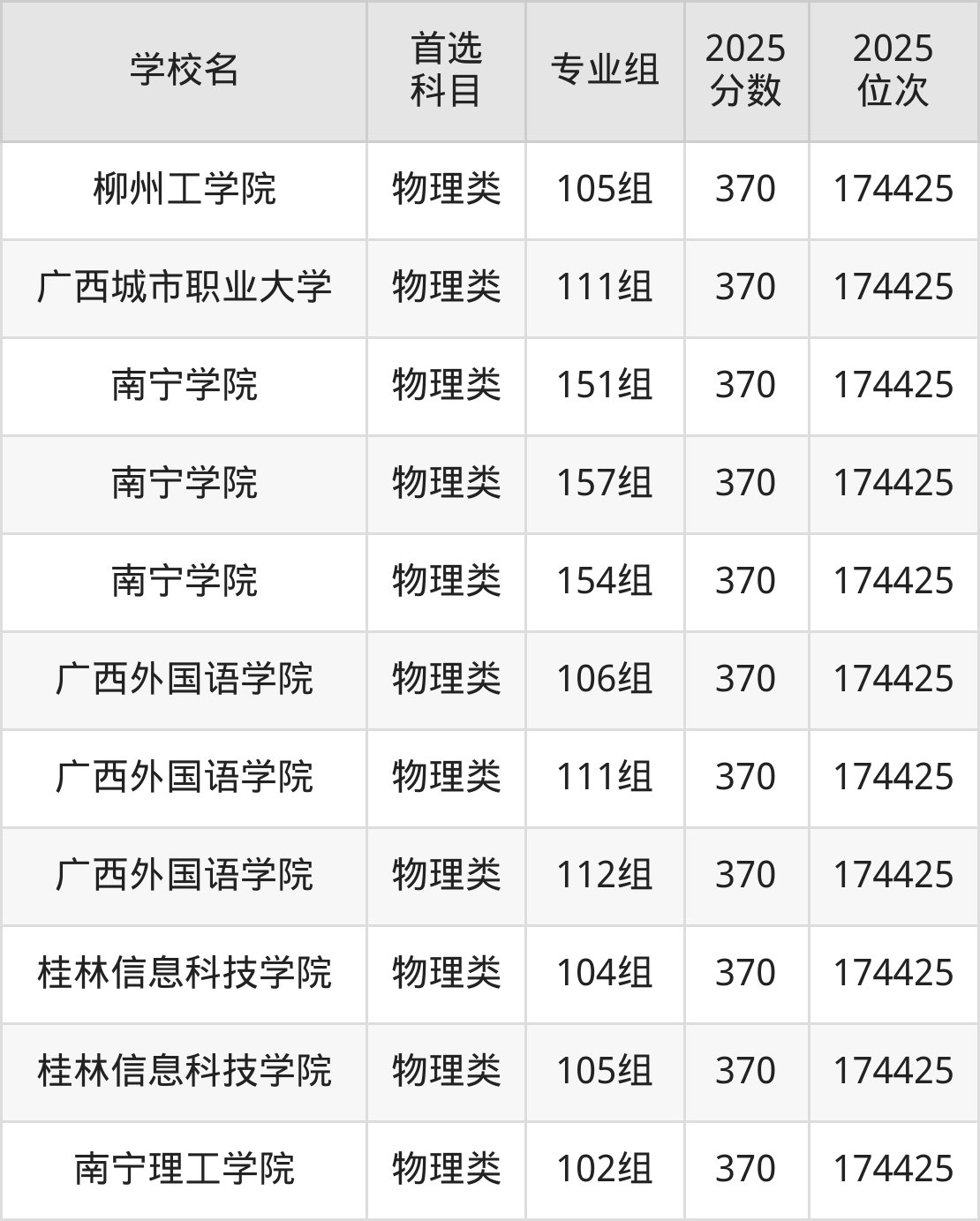 2025年广西二本大学最低录取分数线是370分,收分最低的学校为南宁学院158组。