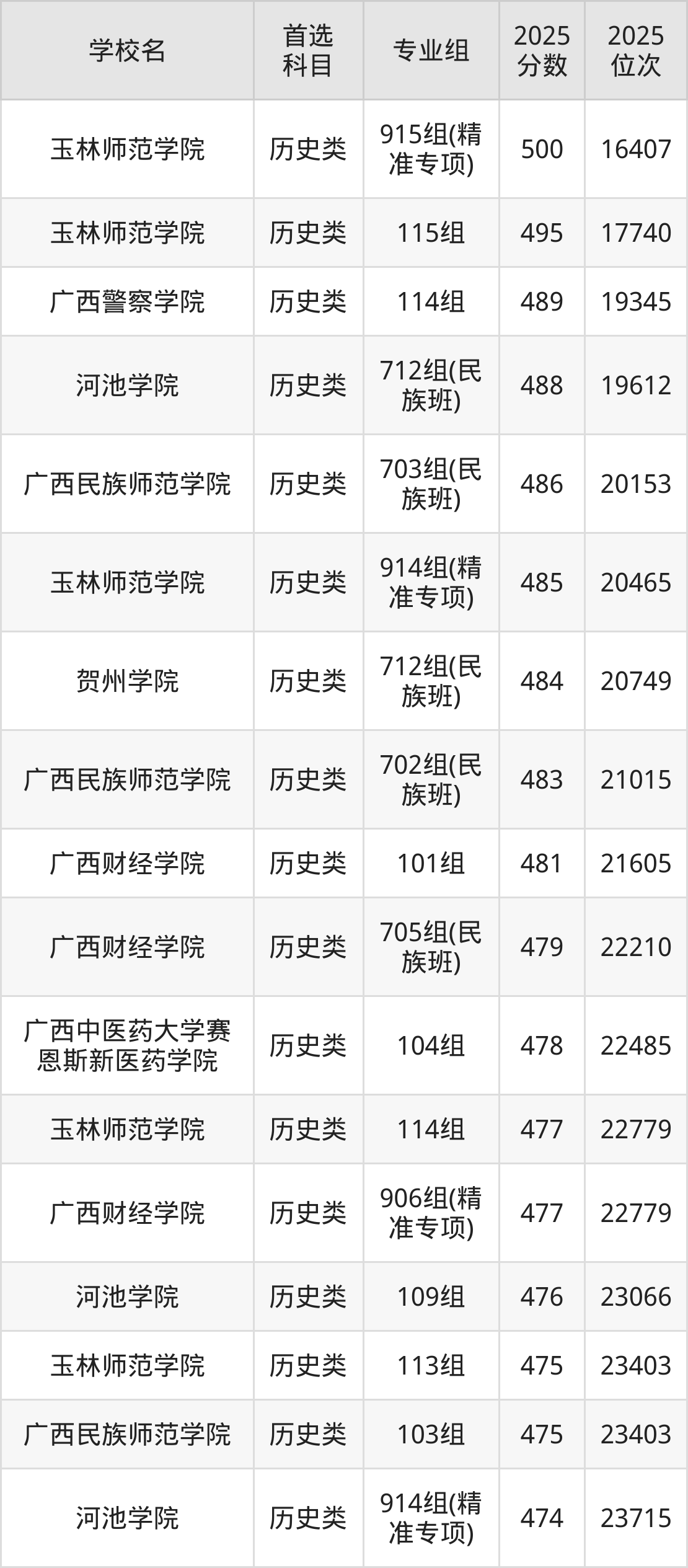 2025年一共有28所二本大学在广西历史类招生,包含了114个专业组,录取分数线从402分到500分不等,对应最低位次从53085名到16407名。下面分别展示广西壮族自治区分数线最高、最低的五个院校专业组。
