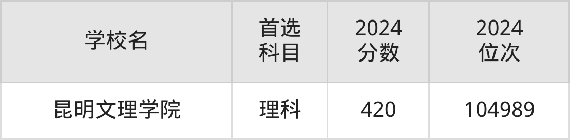 (5)昆明文理学院:420分、104989名;