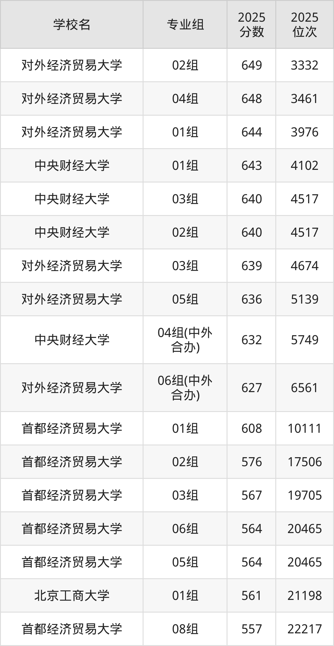 (1)对外经济贸易大学(02):649分、3332名;