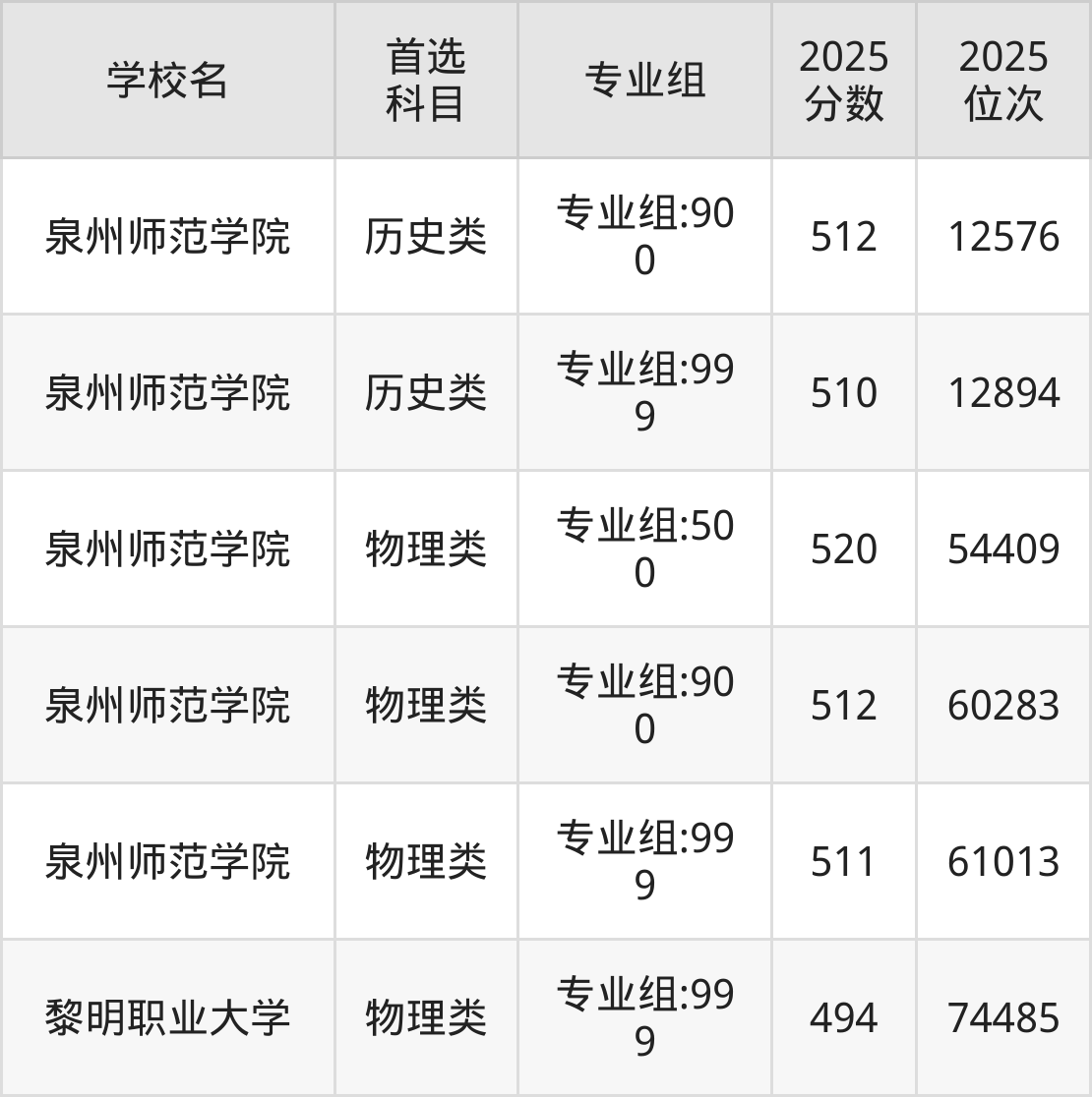 2025年一共有1所公办二本大学在泉州历史类招生,包含了2个专业组,录取分数线从510分到512分不等,对应最低位次从12894名到12576名。