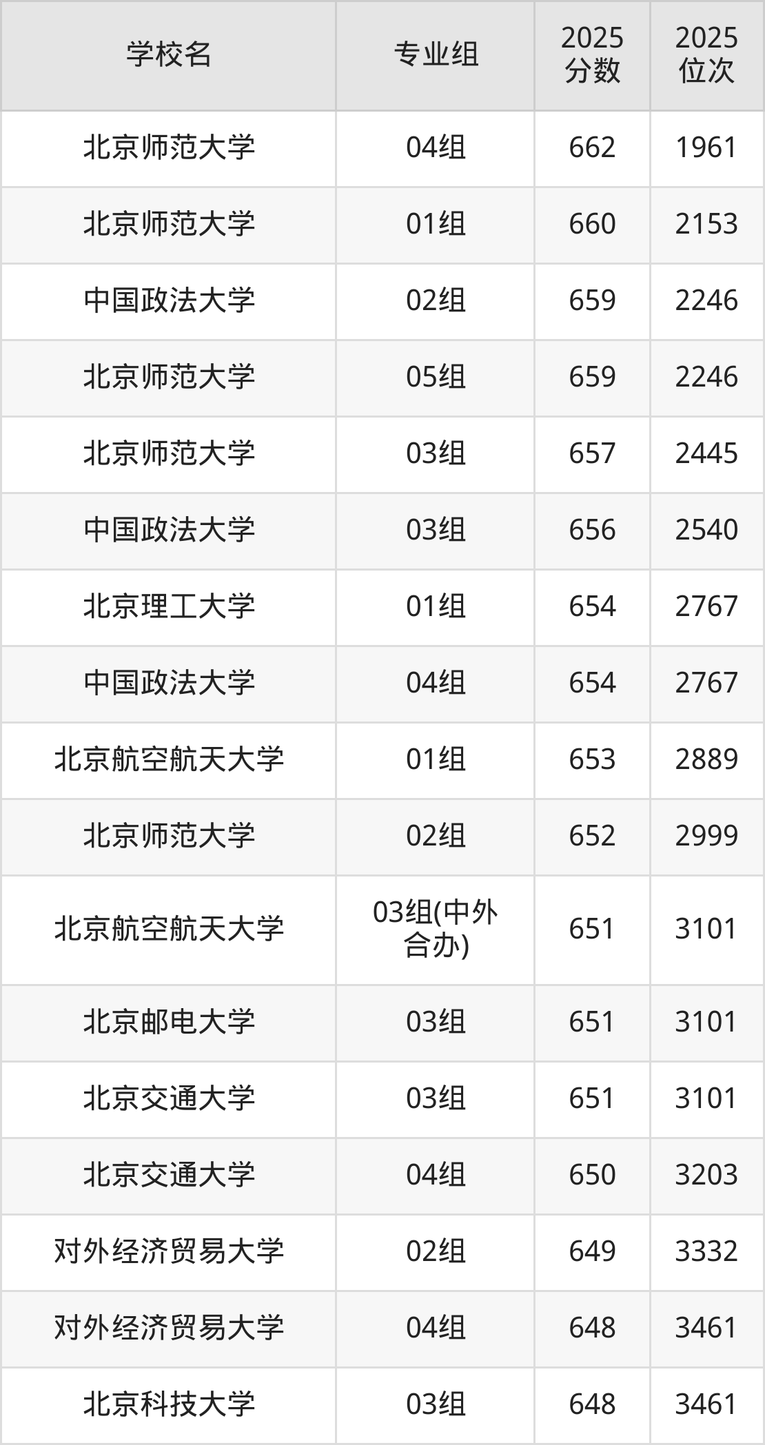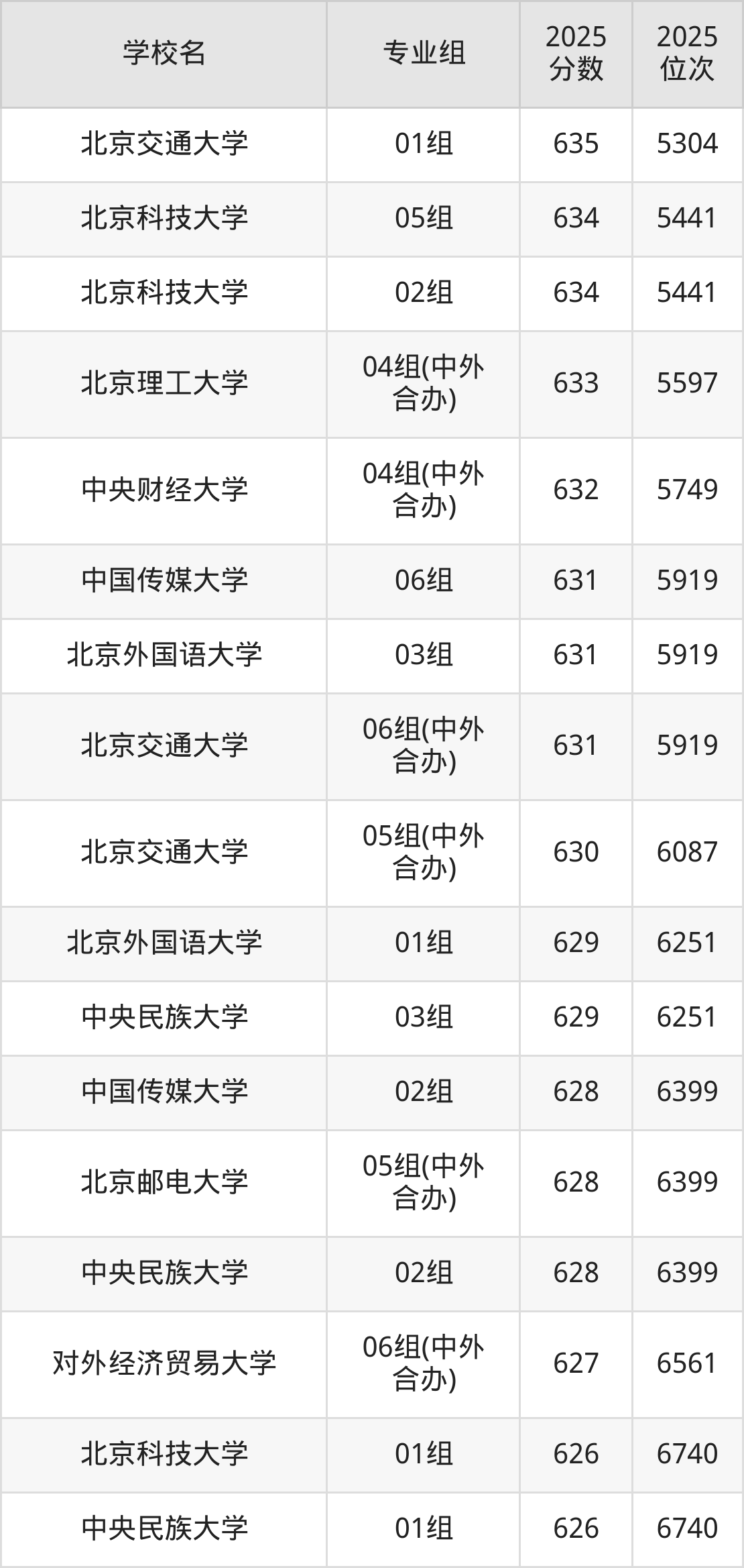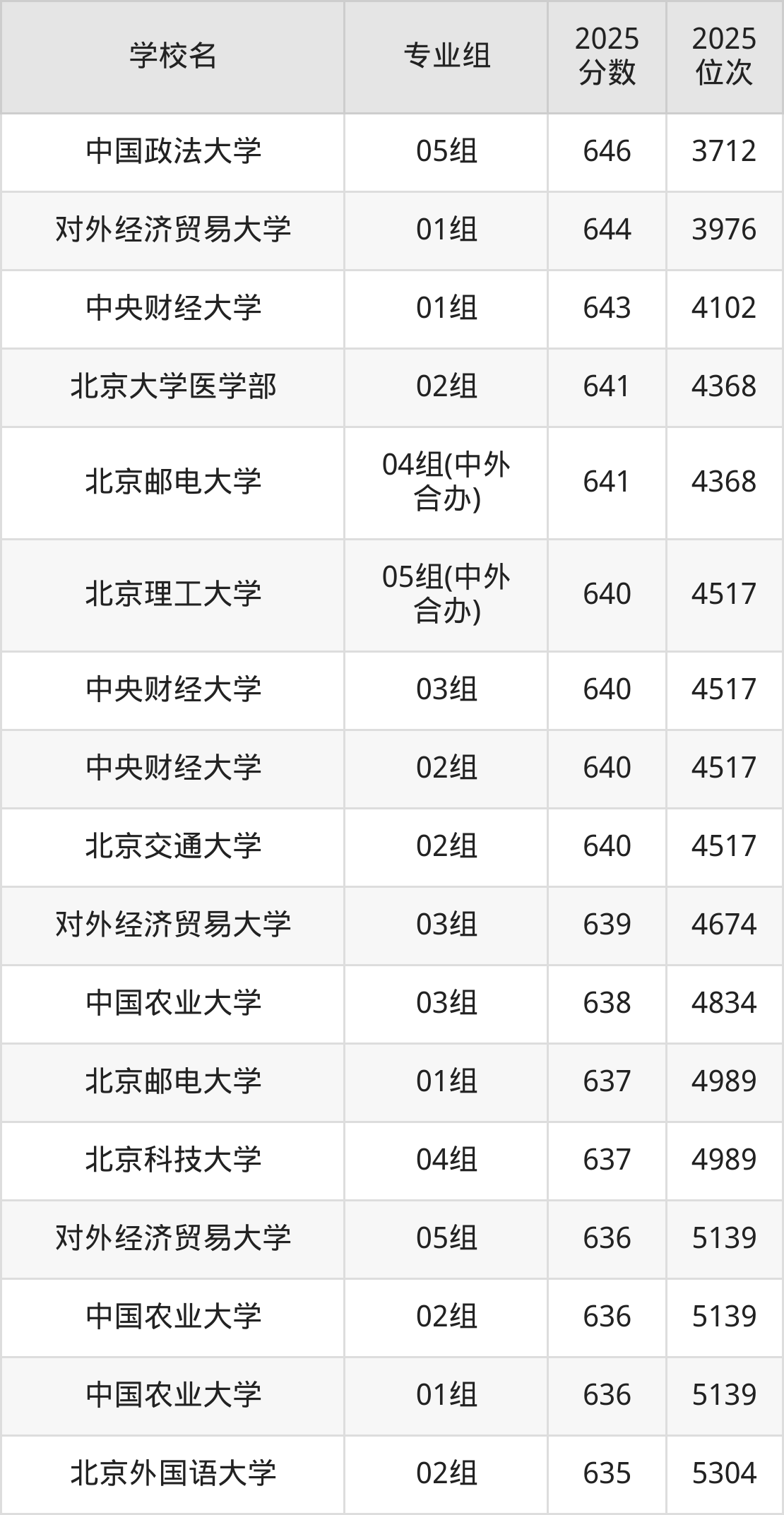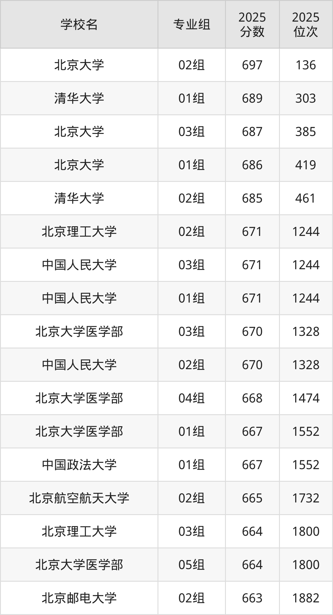 2025年一共有26所211在北京招生,包含了127个专业组,录取分数线从523分到697分不等,对应最低位次从31409名到136名。下面分别展示北京市分数线最高、最低的五个院校专业组。