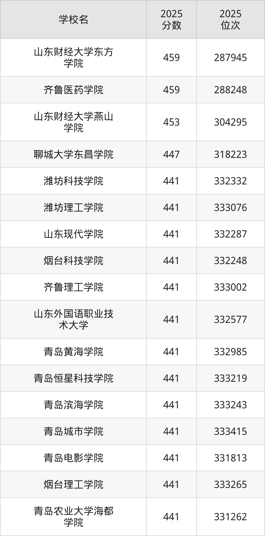 (1)山东财经大学东方学院:459分、287945名;