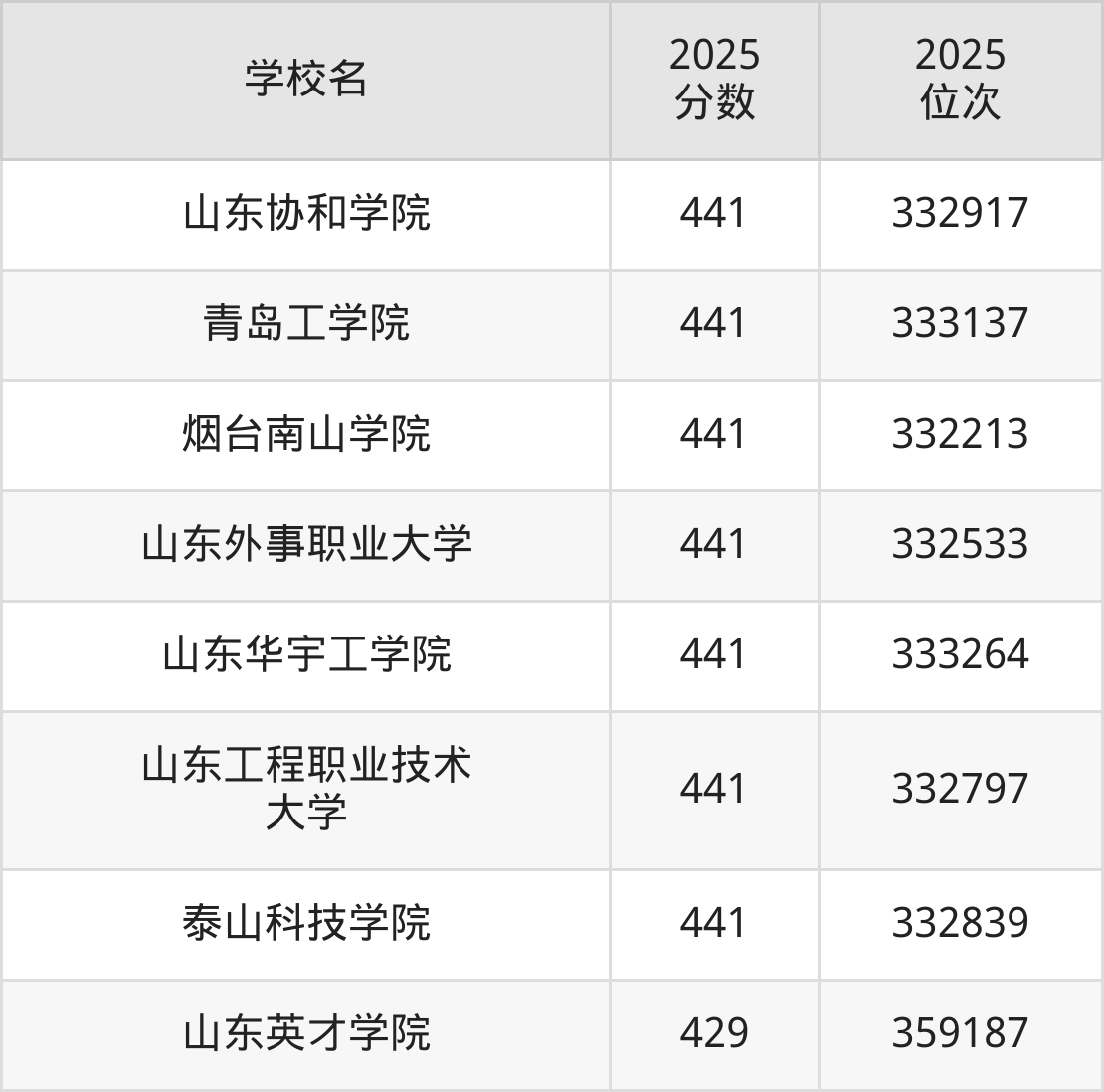 (3)山东工程职业技术大学:441分、332797名;