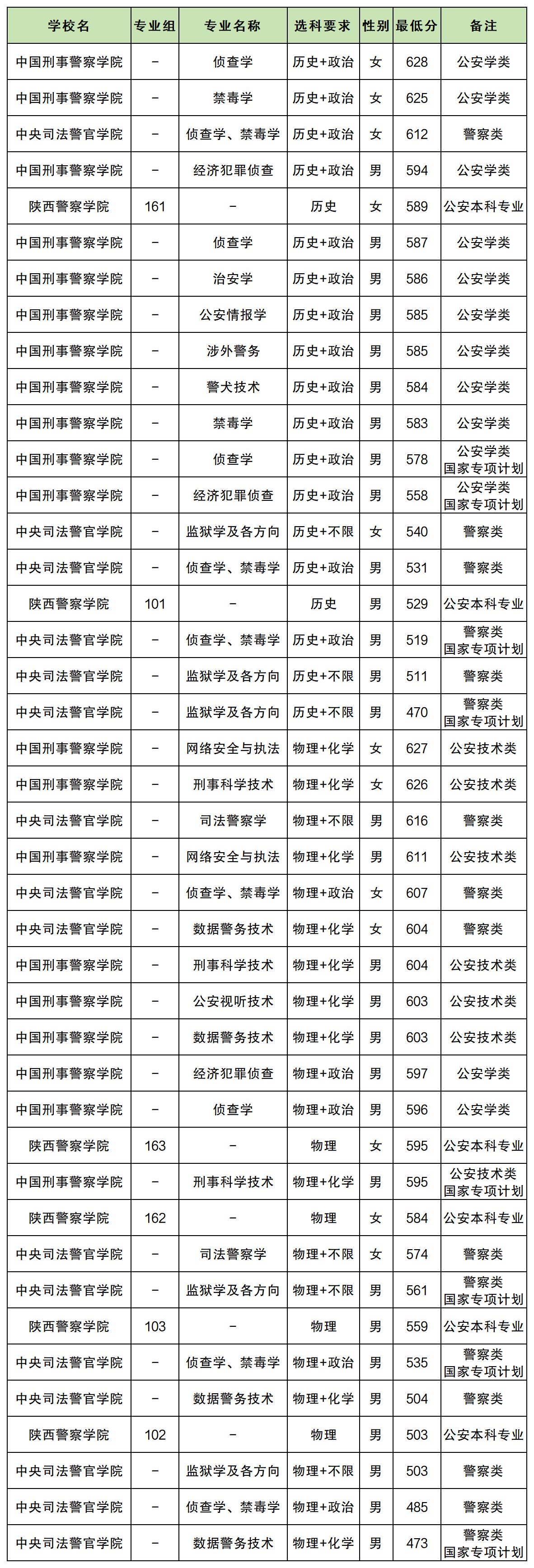 最低录取分数线为:男生470分、女生540分,招生院校均为中央司法警官学院。