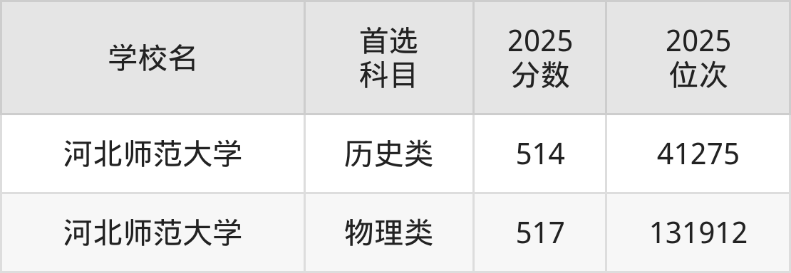 2025年河北本科批次线历史类477分、物理类459分。因此石家庄考生如果想留在市内读师范类大学的话,历史类考生至少需要过线37分、而物理类考生至少需要过线58分。