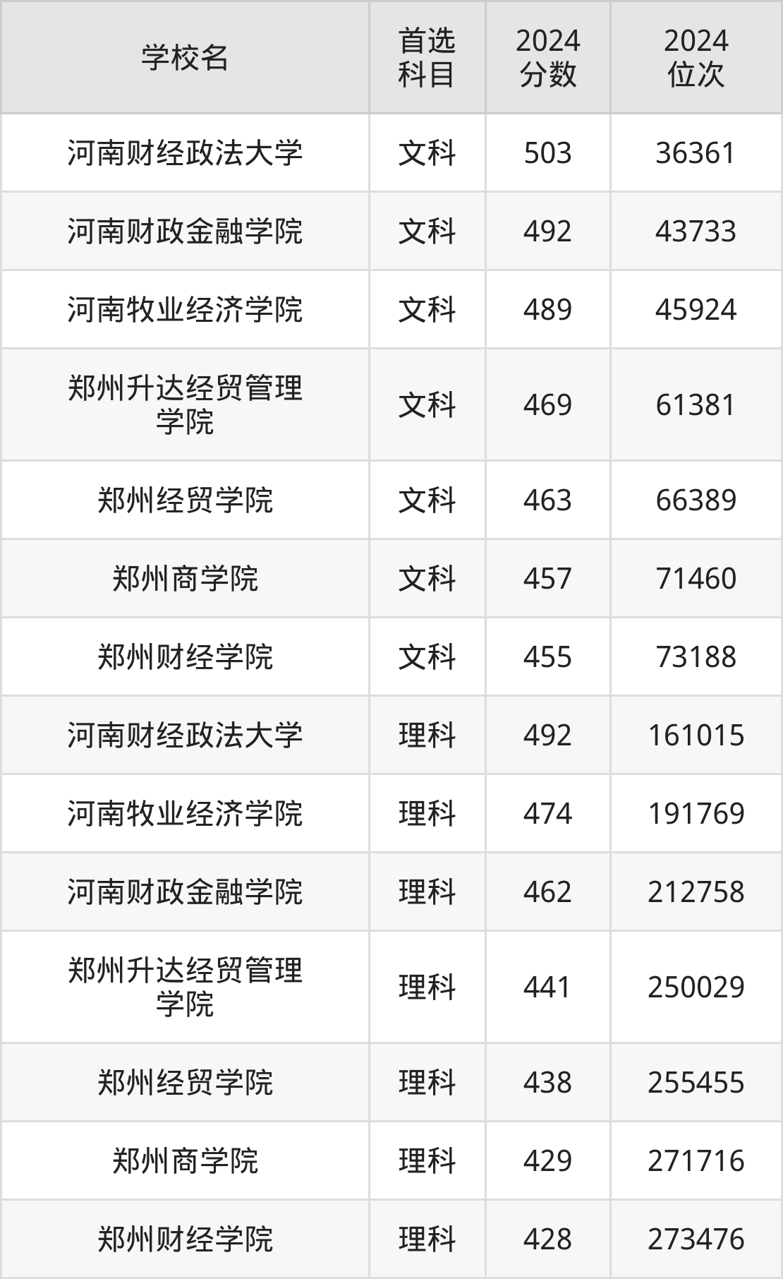2024年一共有7所二本财经大学在河南文科招生,录取分数线从455分到503分不等,对应最低位次从73188名到36361名。下面分别展示河南省分数线最低的五个院校。