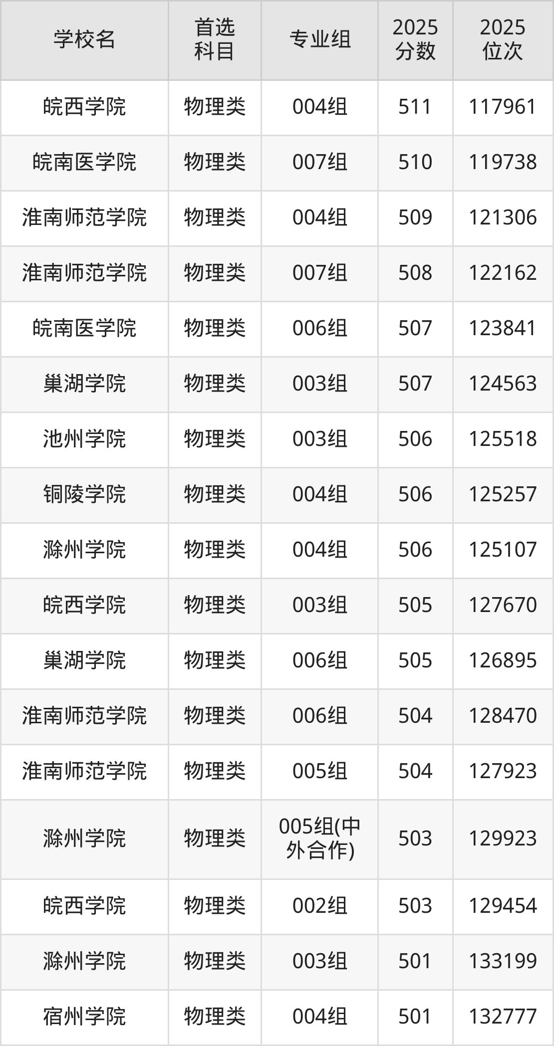 2025年一共有18所公办二本大学在安徽物理类招生,包含了61个专业组,录取分数线从486分到559分不等,对应最低位次从155657名到60759名。下面分别展示安徽省分数线最高、最低的五个院校专业组。