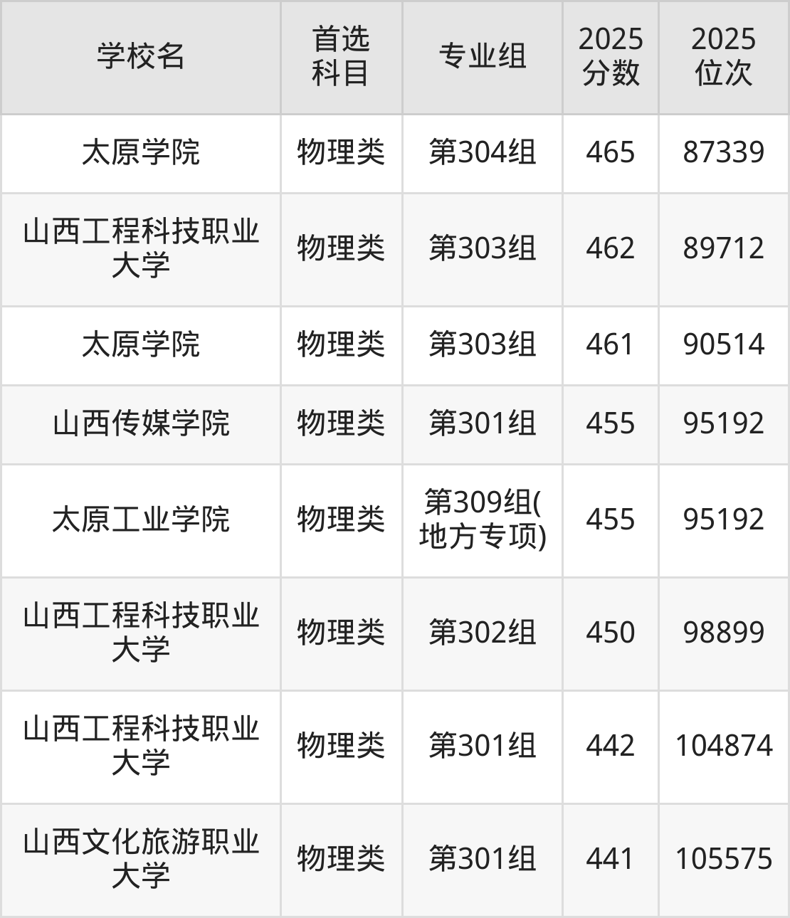 (5)山西文化旅游职业大学第301组:441分、105575名;