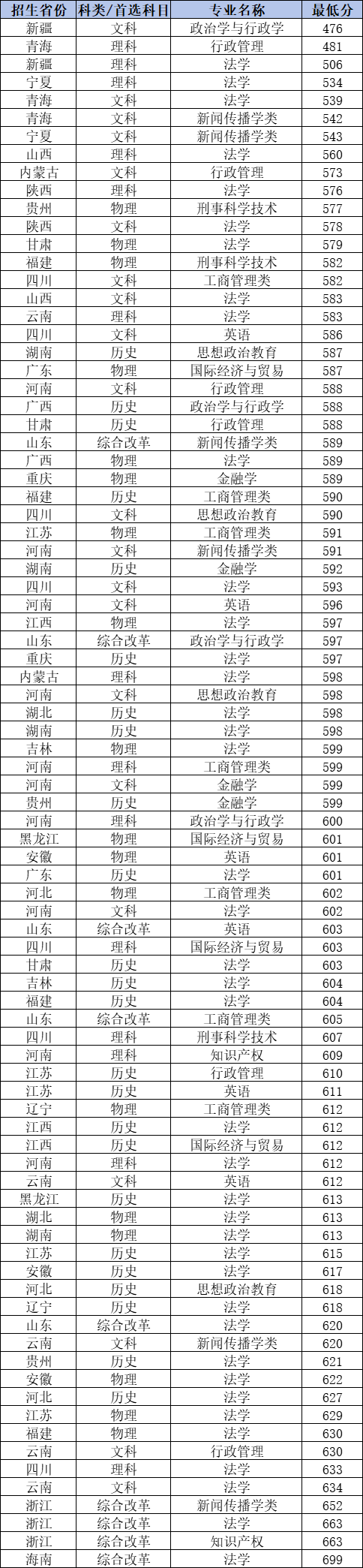 以2024年高考招录数据为例,西南政法大学高校专项计划在全国各省招生分数范围位于476分~699分之间。其中重庆考生物理类最低需589分(金融学),历史类最低需597分(法学);新疆考生理科最低需506分(法学),文科最低需476分(政治学与行政学)等。