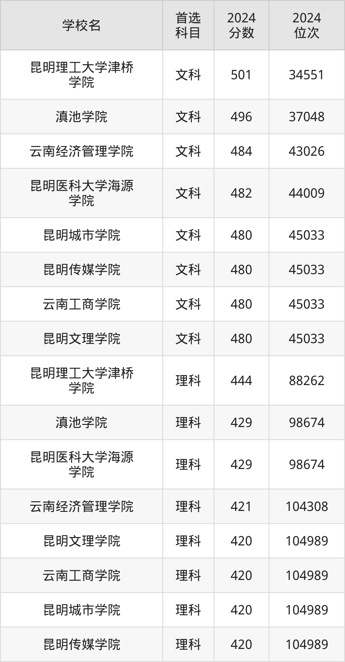 2024年云南本科批次线文科480分、理科420分。因此昆明考生如果想留在市内读民办本科的话,文科考生刚过本科线就行、而理科考生刚过本科线就行。