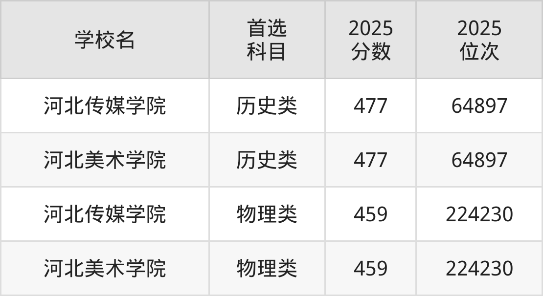 2025年一共有2所艺术类大学在河北历史类招生,录取分数线477分,对应最低位次64897名。