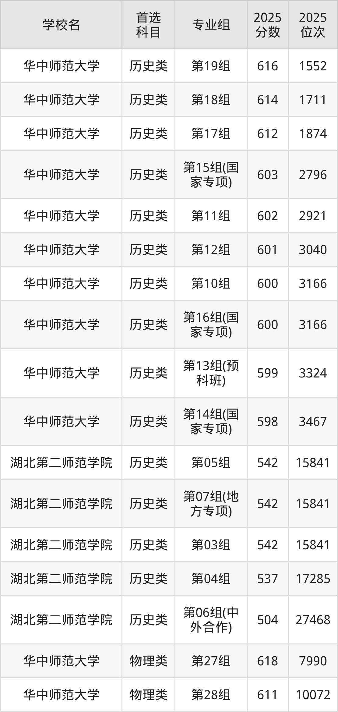 (4)华中师范大学第15组(国家专项计划):603分、2796名;